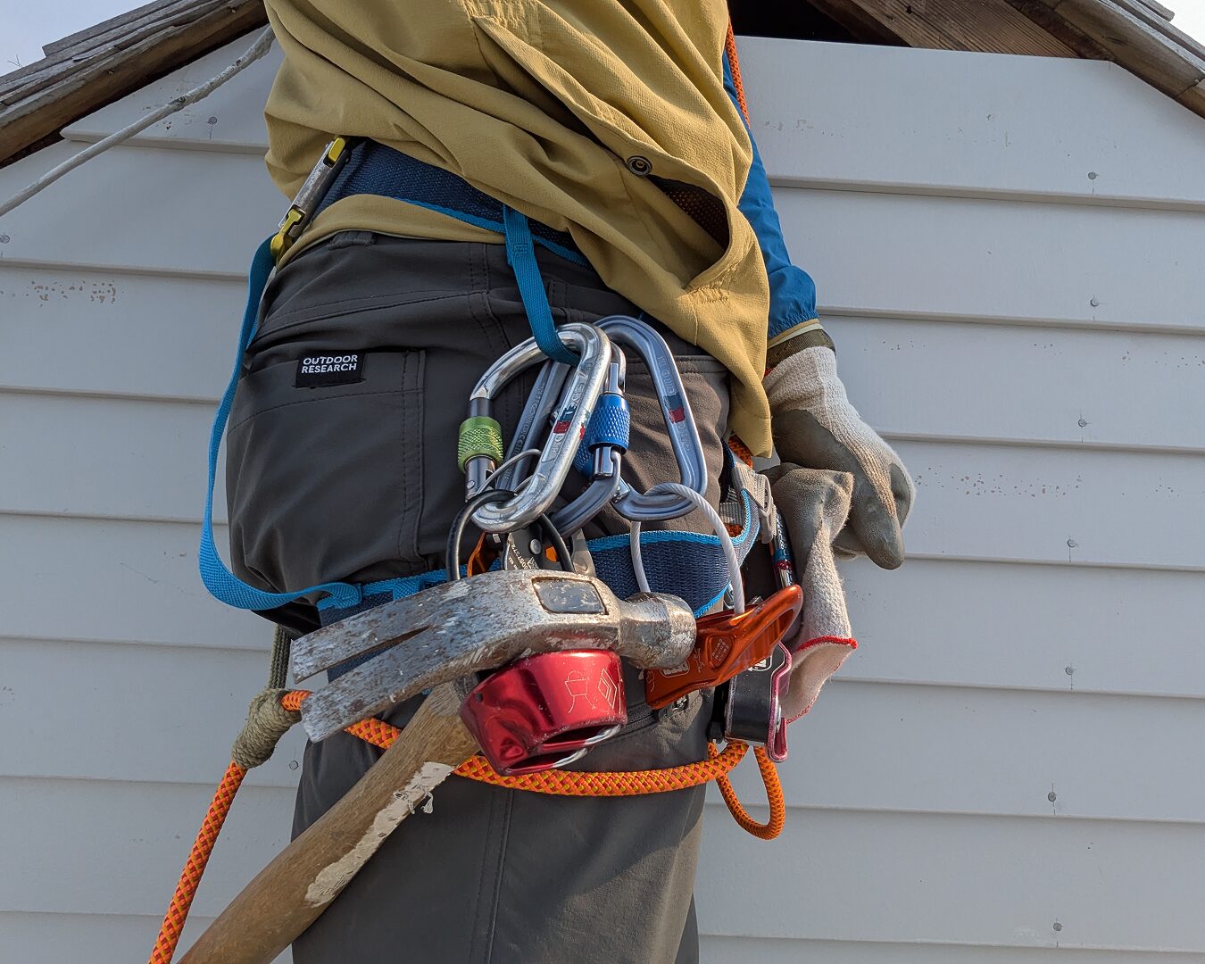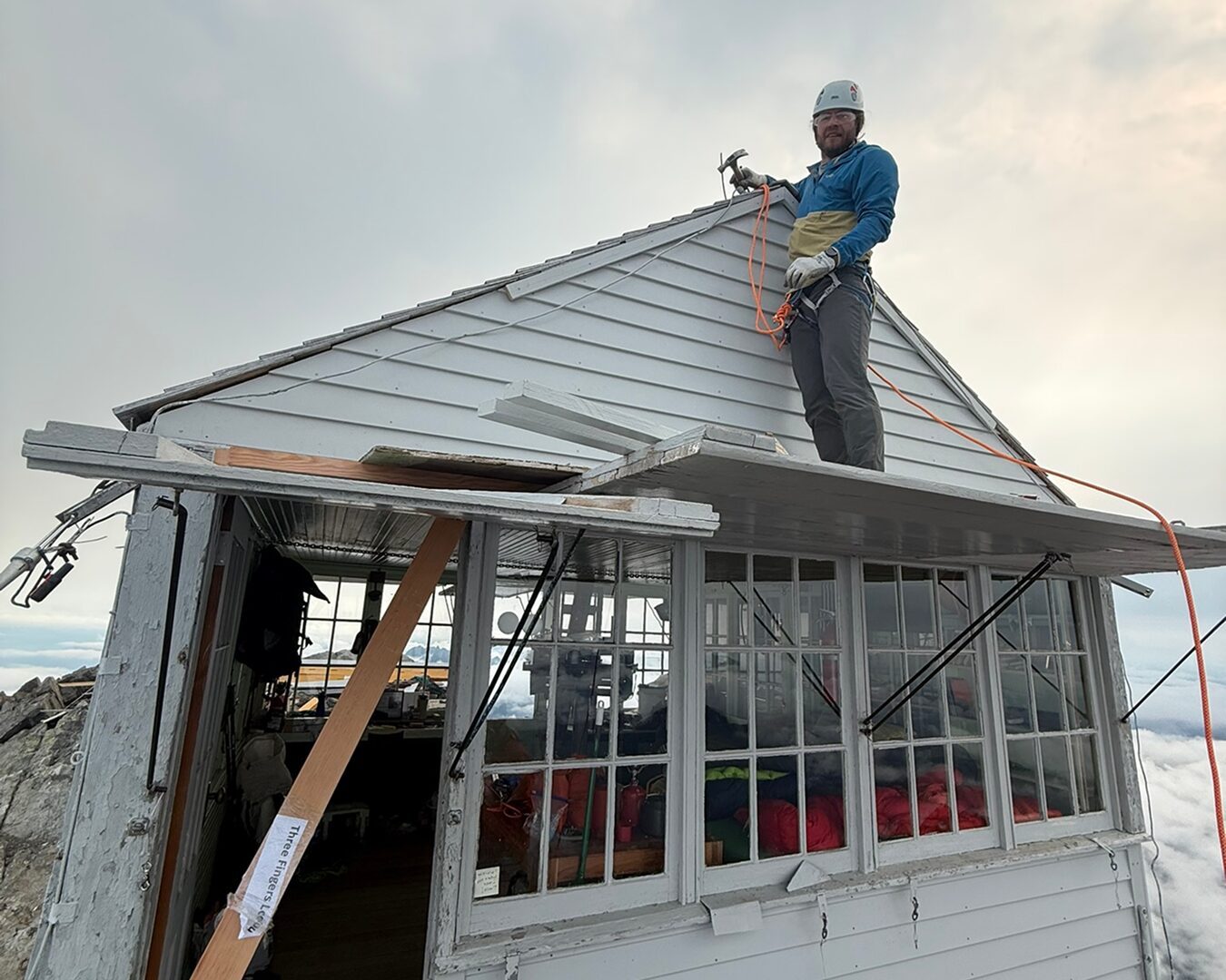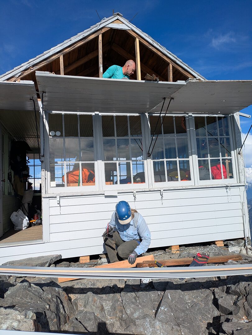 On this trip, we removed the old, rotten siding from the gable ends of the building and replaced it with new siding that had been primed and painted down in the valley, and flown up to the cabin by helicopter. The work was completed over the course of 4 days, much of it from climbing harnesses, given the extreme exposure and fall risk on top of the lookout. Since the lookout is in the Wilderness, no power tools are permissible in the repair work, so we worked entirely with hand brace drills, hand saws, hammers, and nails.