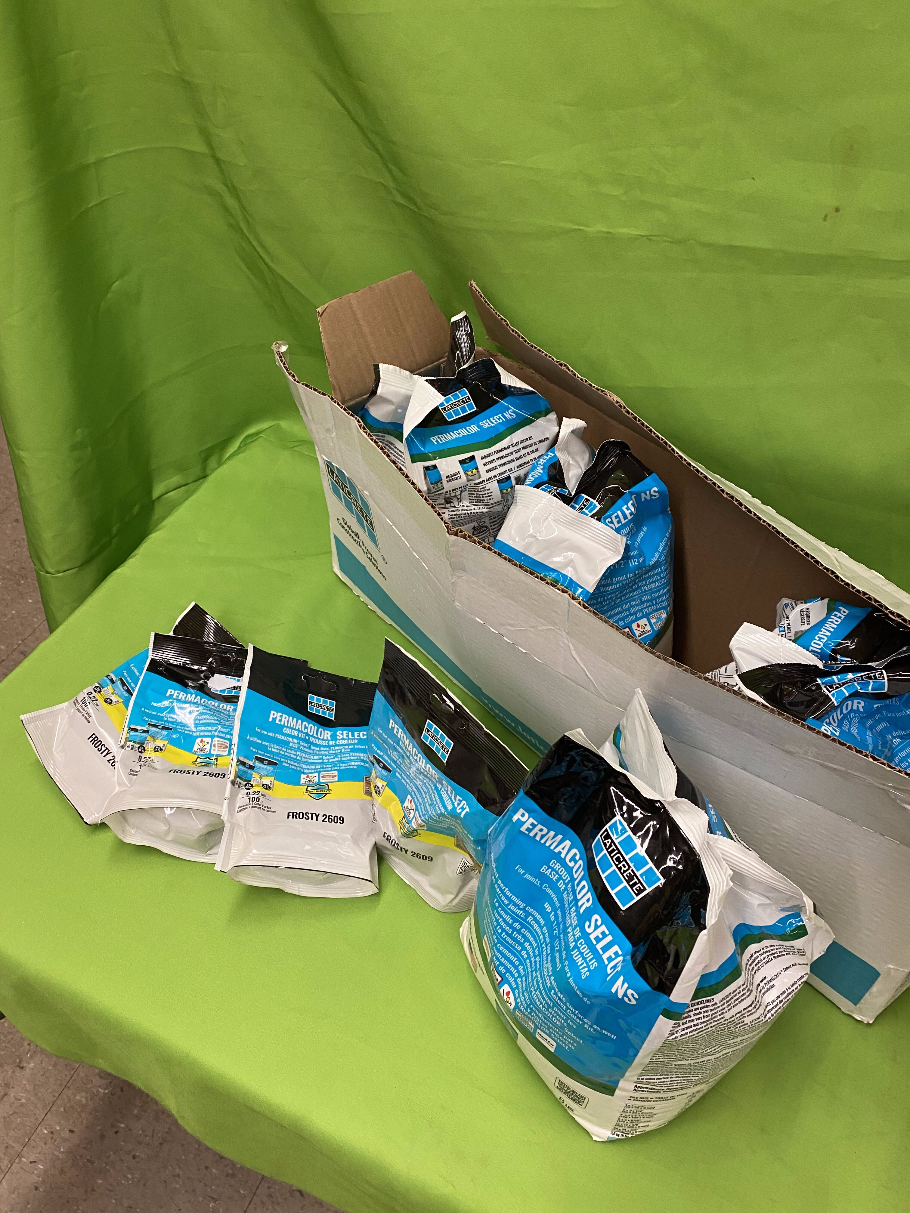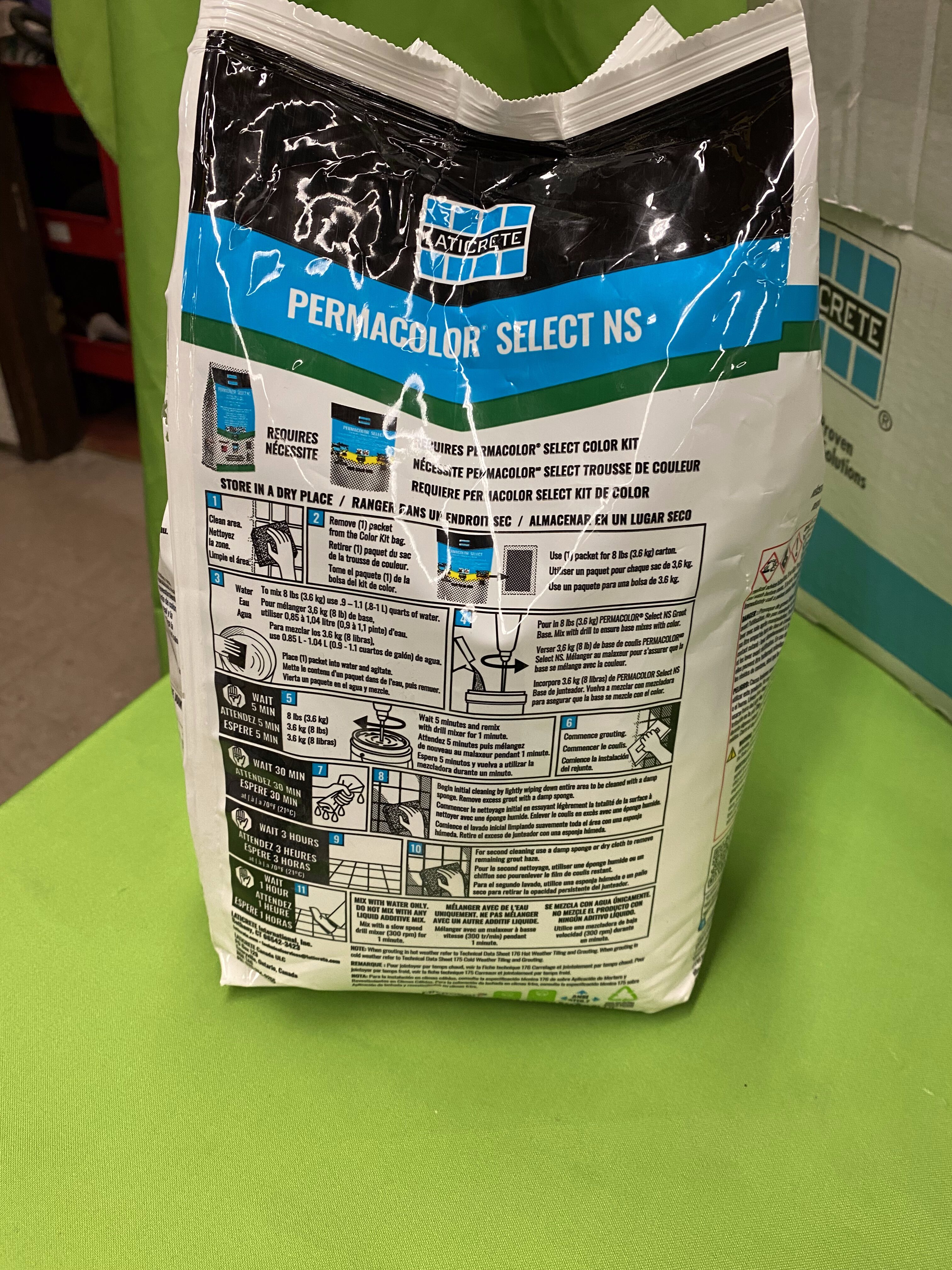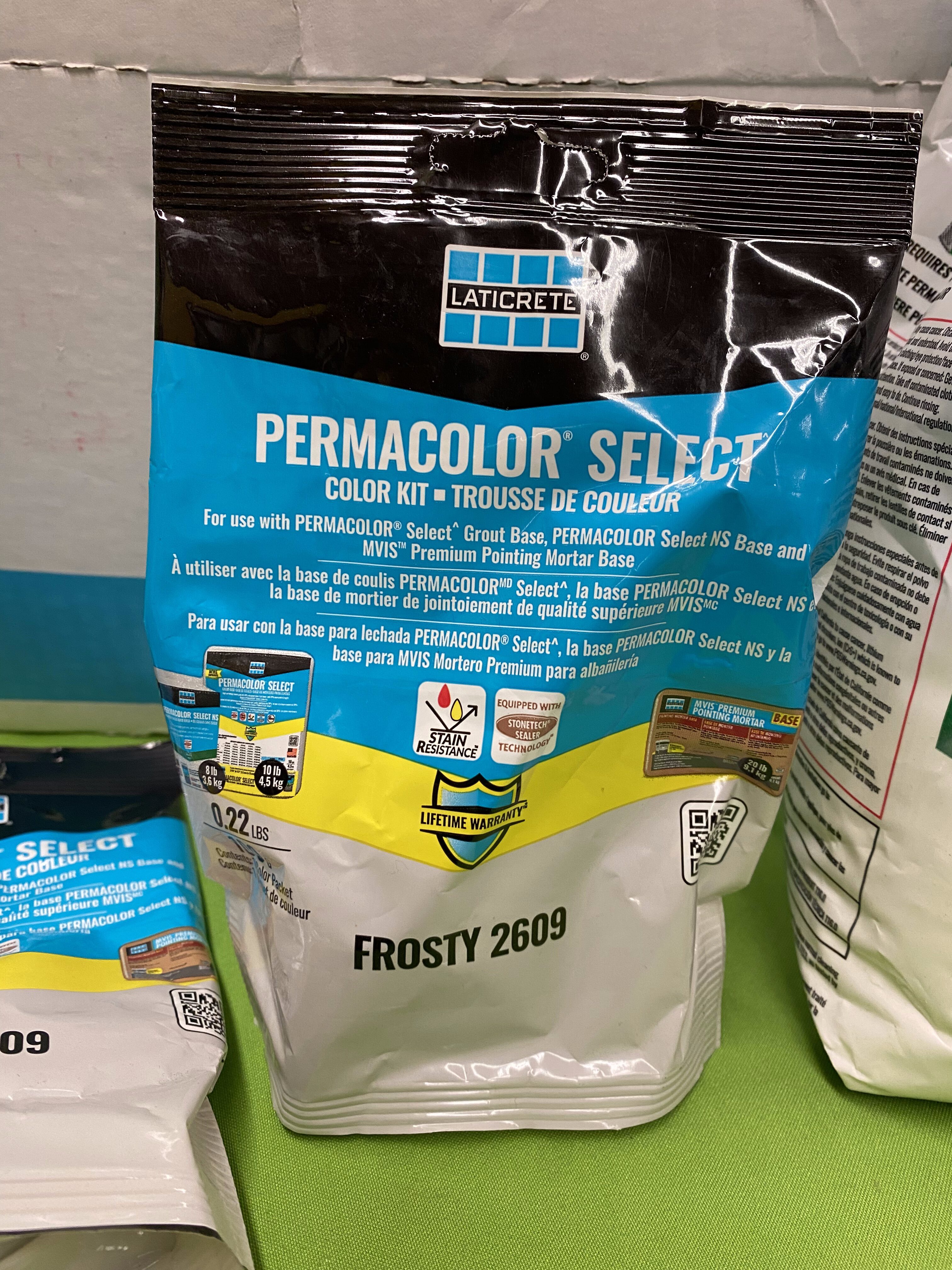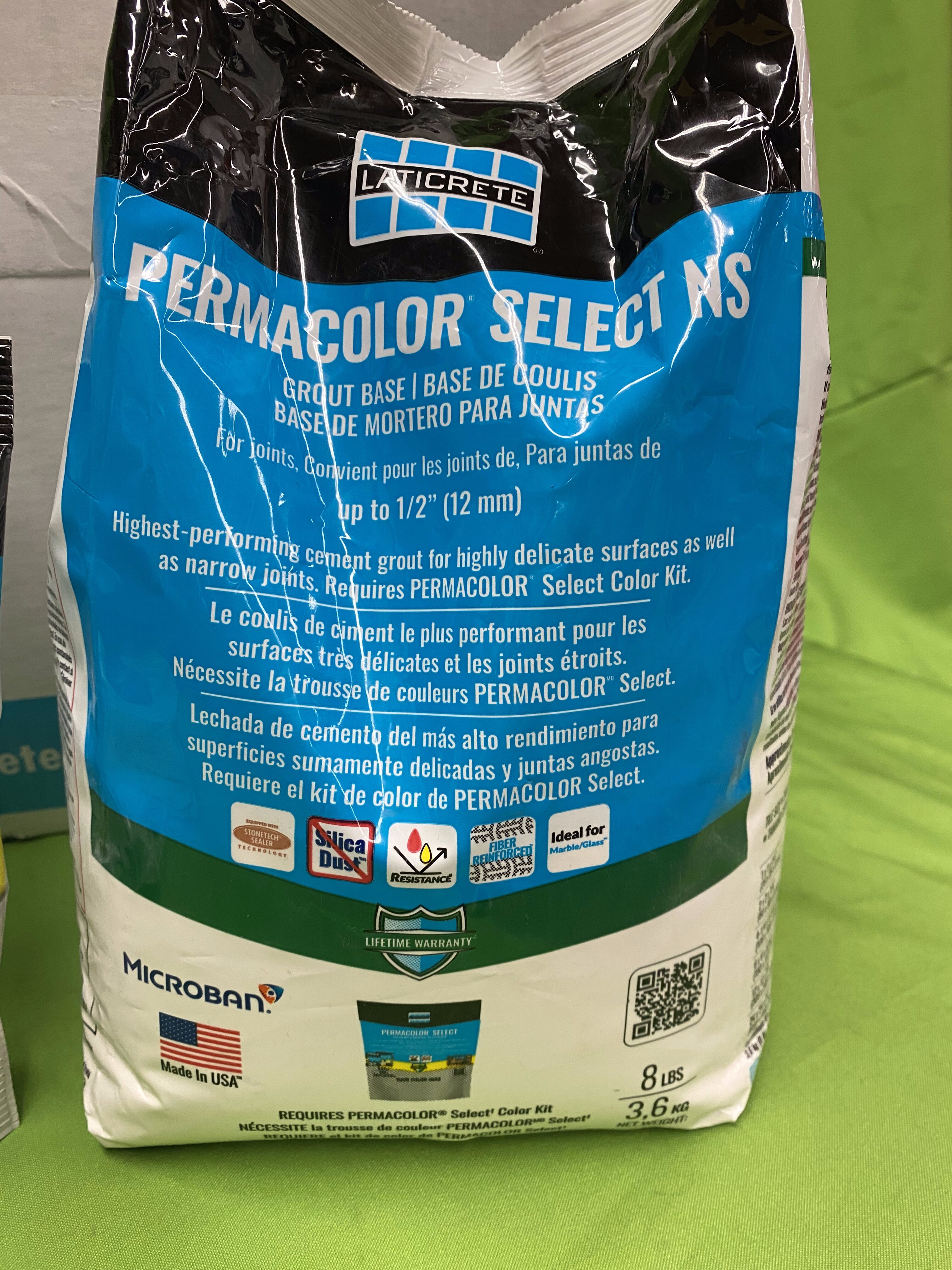 32-lb supply of PERMACOLOR Select NS Grout Base with Frosty (2609) color kits (four 8-lb base bags plus four matching dry pigment color kits). PERMACOLOR Select NS is an ultra-premium, polymer-fortified, unsanded portland-cement grout base designed especially for delicate surfaces like highly polished marble or soft glass. It’s suitable for use in joints up to ½ inch wide. This grout base exceeds ANSI 118.7 standards, is non-shrinking, non-dusting, non-yellowing, easy to clean, and includes built-in Microban® antimicrobial protection to inhibit mold and mildew on the grout surface. All components are new and unopened. Ideal for interior, exterior, and even submerged installations.