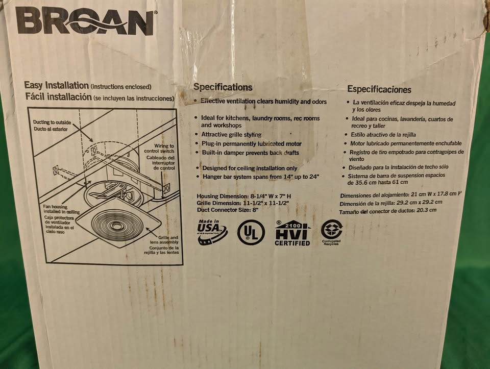 8″ Vent fan designed to discharge into a vertical duct. Manufacturer recommends use in kitchens, laundry rooms, and workshops.