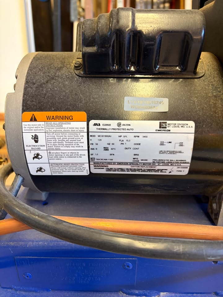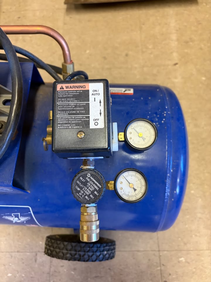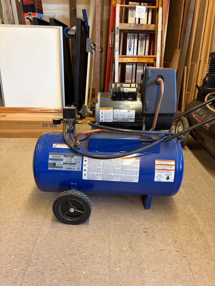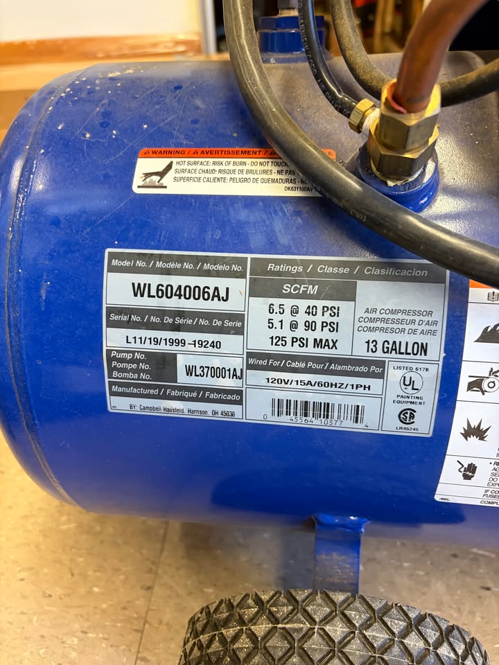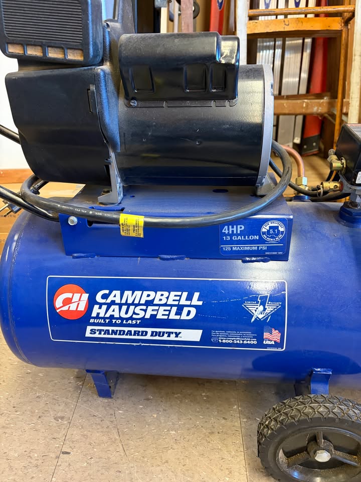 Campbell Hausfeld standard duty air compressor, 13 gallons, 4 HP, and 125 PSI max. In very good condition, very portable with large rubber wheels.