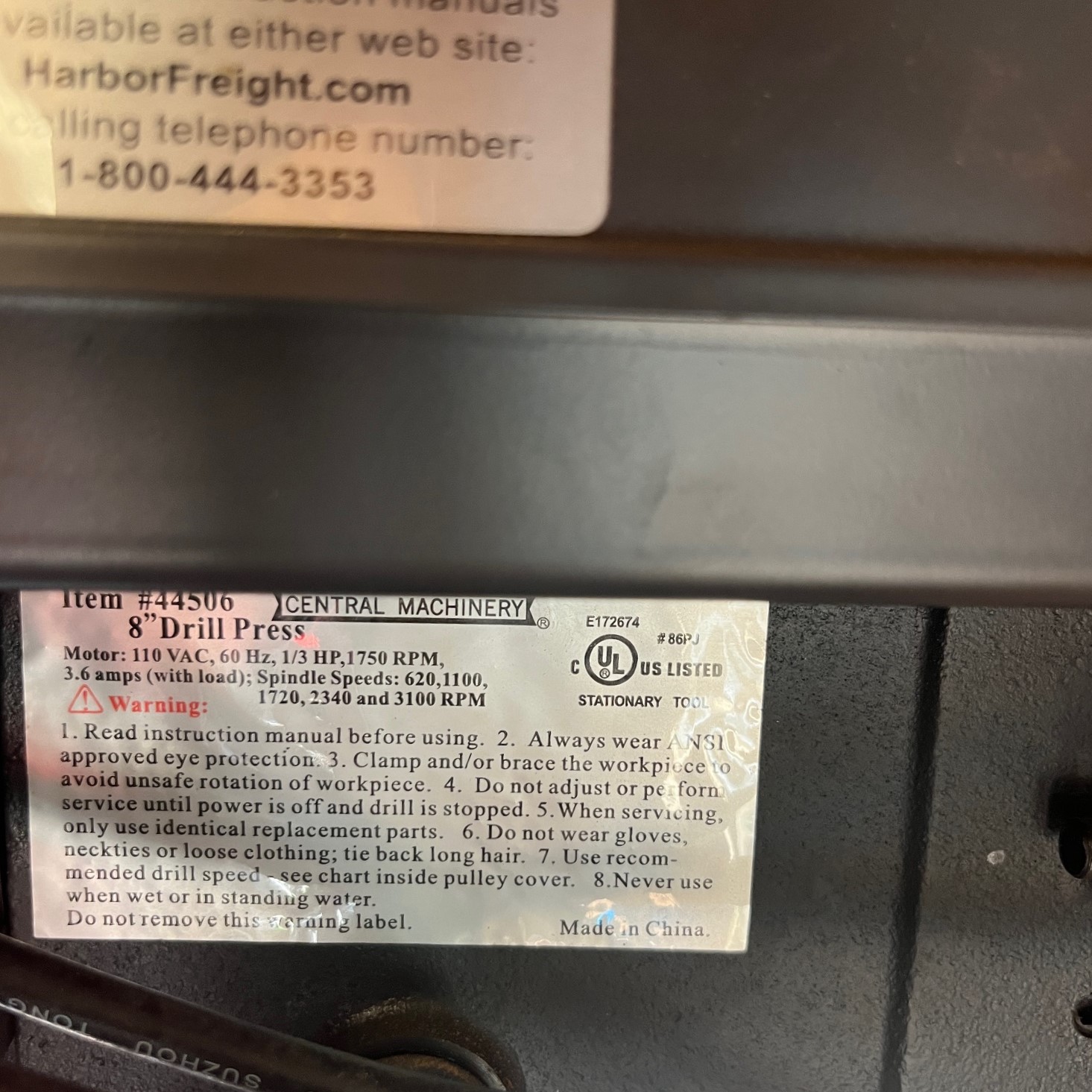 Central Machinery 8" drill press. Multiple speeds. Very clean.