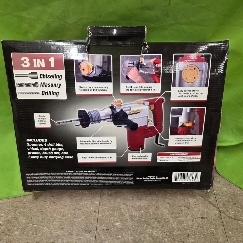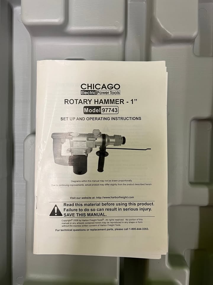 Like new 1″ SDS rotary hammer from Chigaco Electric. Can do drilling, hammering, and both! Great for heavy-duty drilling or chiseling. Has 5.2 amps and includes some bits.