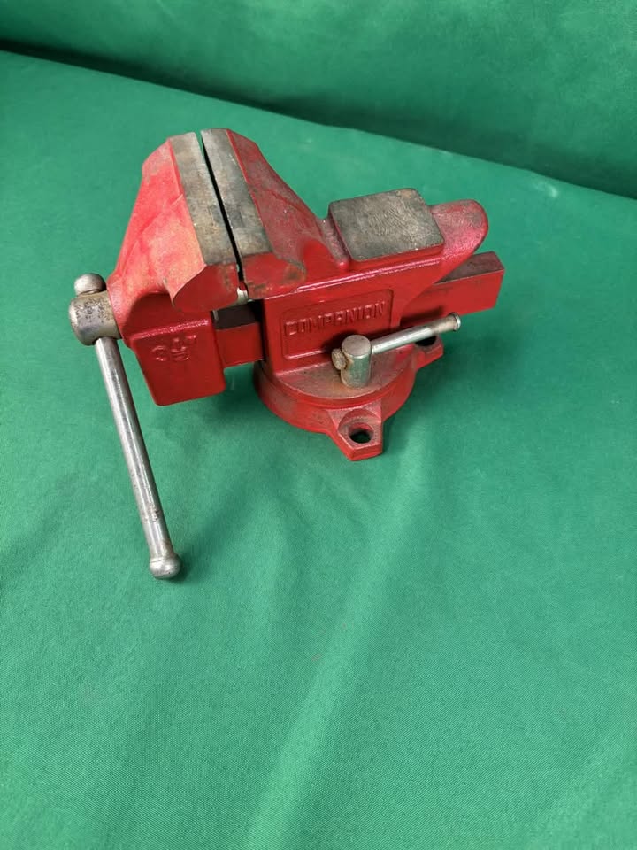 Great condition red Companion 3 1/2″ vise. Heavy duty with holes to be bolted to a table.