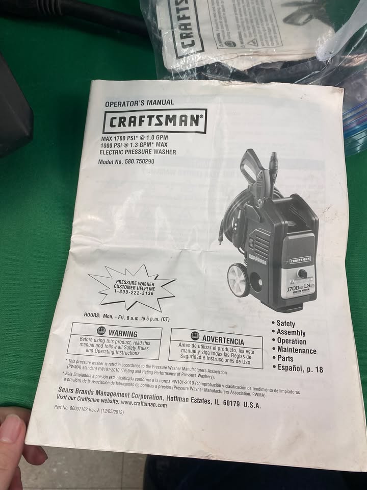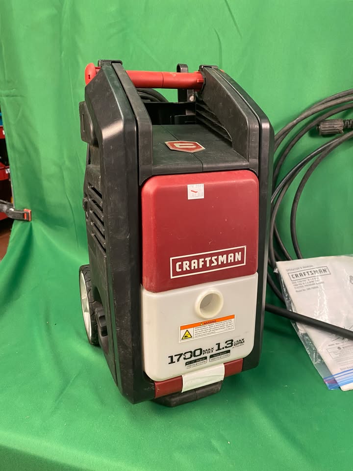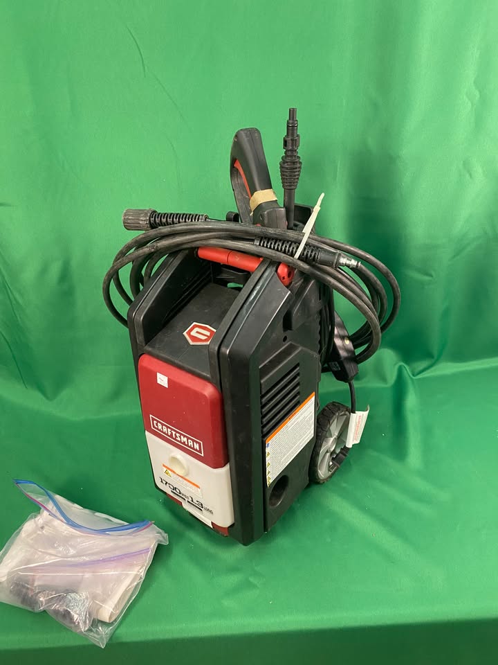 Craftsman electric pressure washer model 580.750290. 1700 PSI and 1.3 max GPM. Includes power cord and hose and the wand comes apart into two pieces for very compact storage.