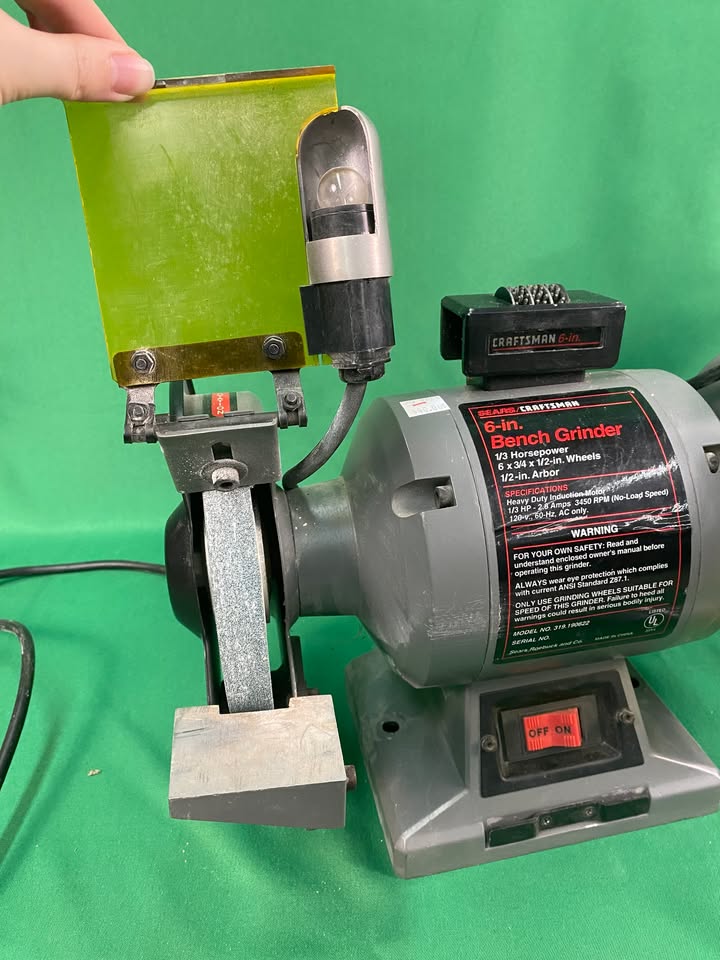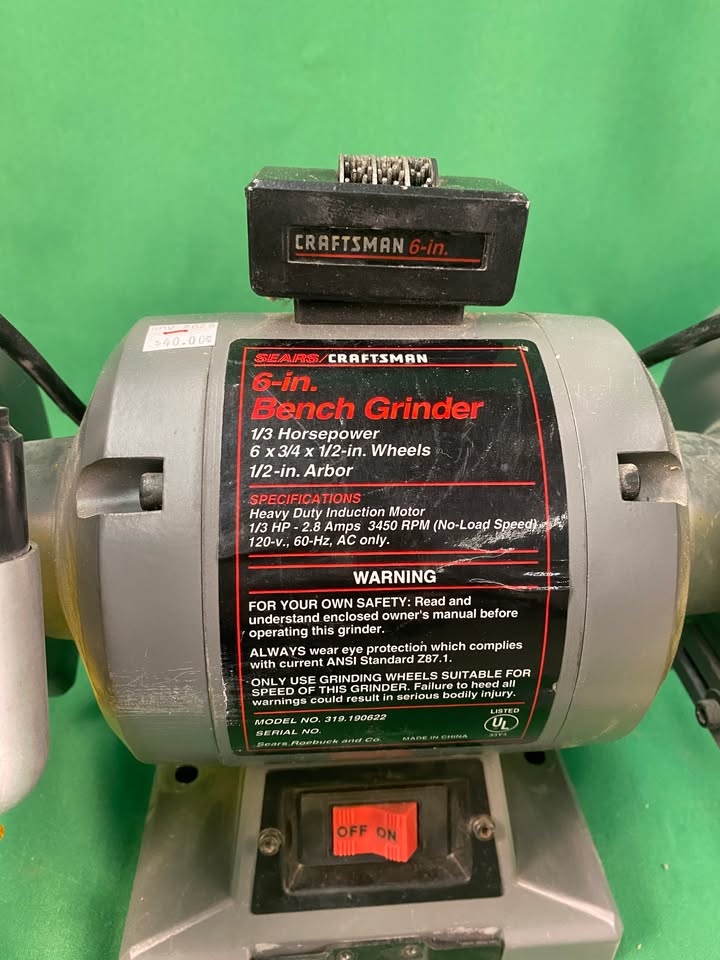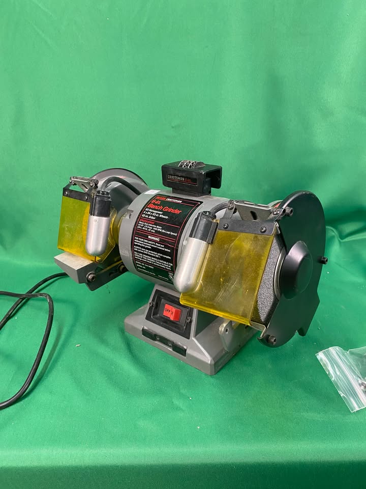 Craftsman 6″ dual wheel bench grinder with removable grinding wheel dresser. Heavy duty at 1/3 HP and includes lights and clear guides for each wheel.