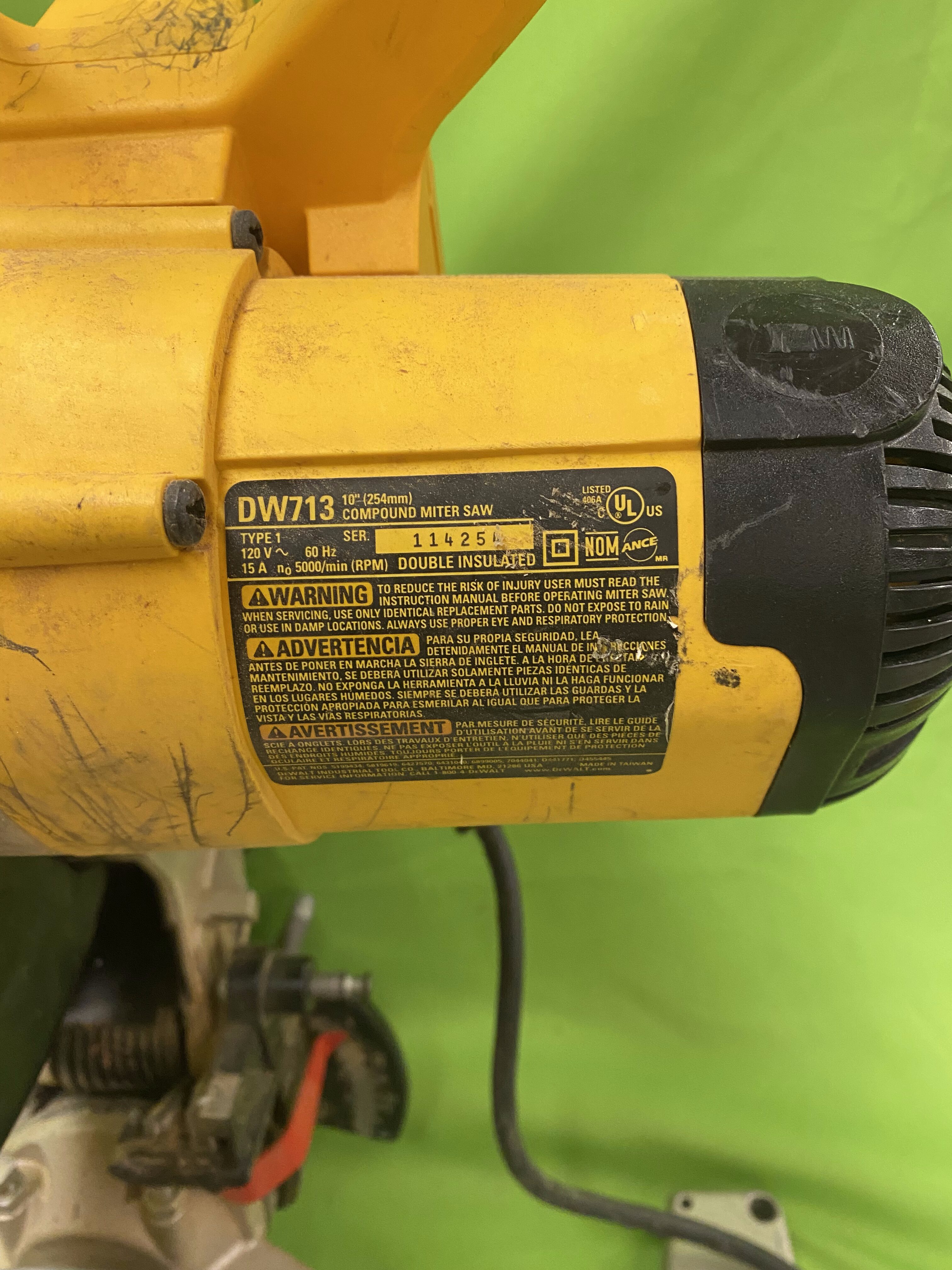This DeWalt DW713 10-inch compound miter saw features a 15 A motor delivering up to 5,000 RPM for powerful, reliable performance. It offers a 10″ blade and a cutting capacity of 2 × 6″ at 45° and 4 × 4″ at 90° so it can handle standard framing lumber and moulding. With its stainless steel detent plate (11 positive stops) and cam-miter lock it provides repeatable accuracy and jobsite durability. The tall sliding fences support vertically nested crown moulding up to 4-1/2″, and the machined base fence support helps maintain square cuts.