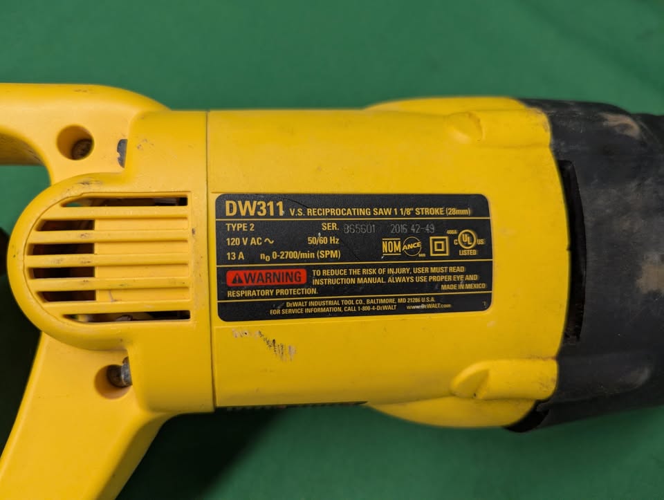 Working corded Dewalt variable speed reciprocating saw with 1 1/8″ stroke. Model DW311.