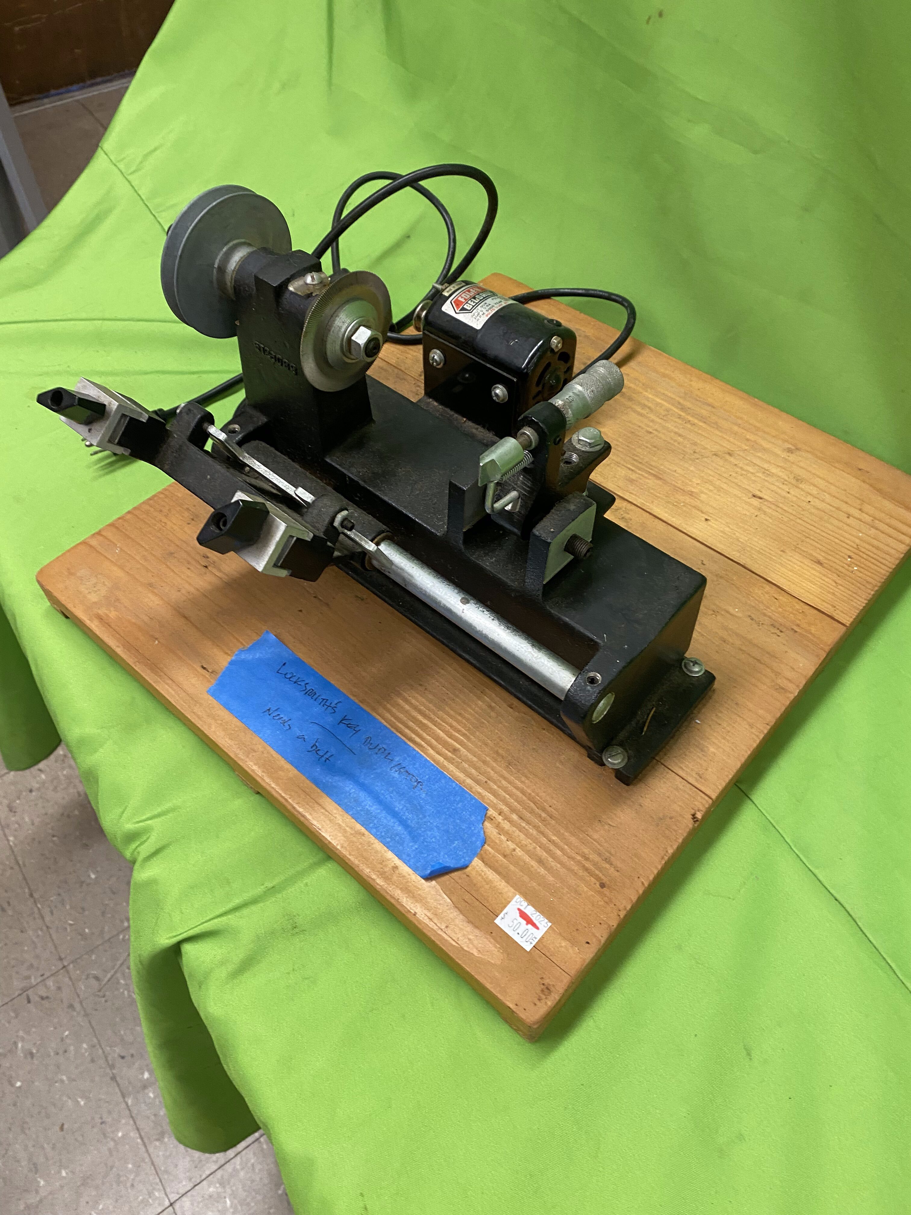 This is a Foley-Belsaw Model 200 duplicating key machine. It’s a precision shop tool designed for duplicating cylinder and flat keys, with micrometer adjustments for accuracy and interchangeable cutters for different key types. Needs a new motor belt.