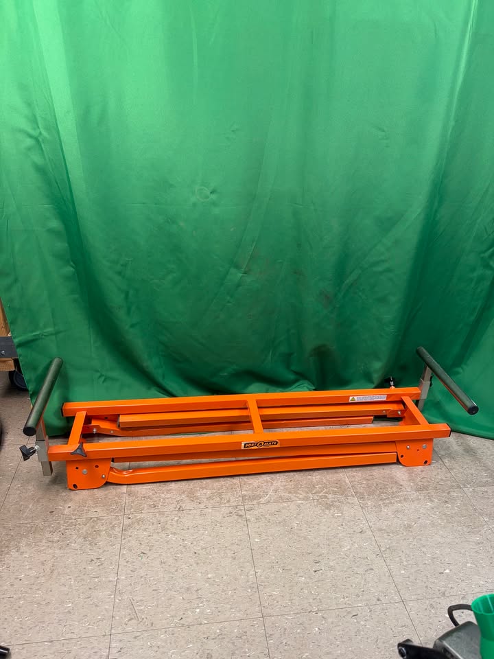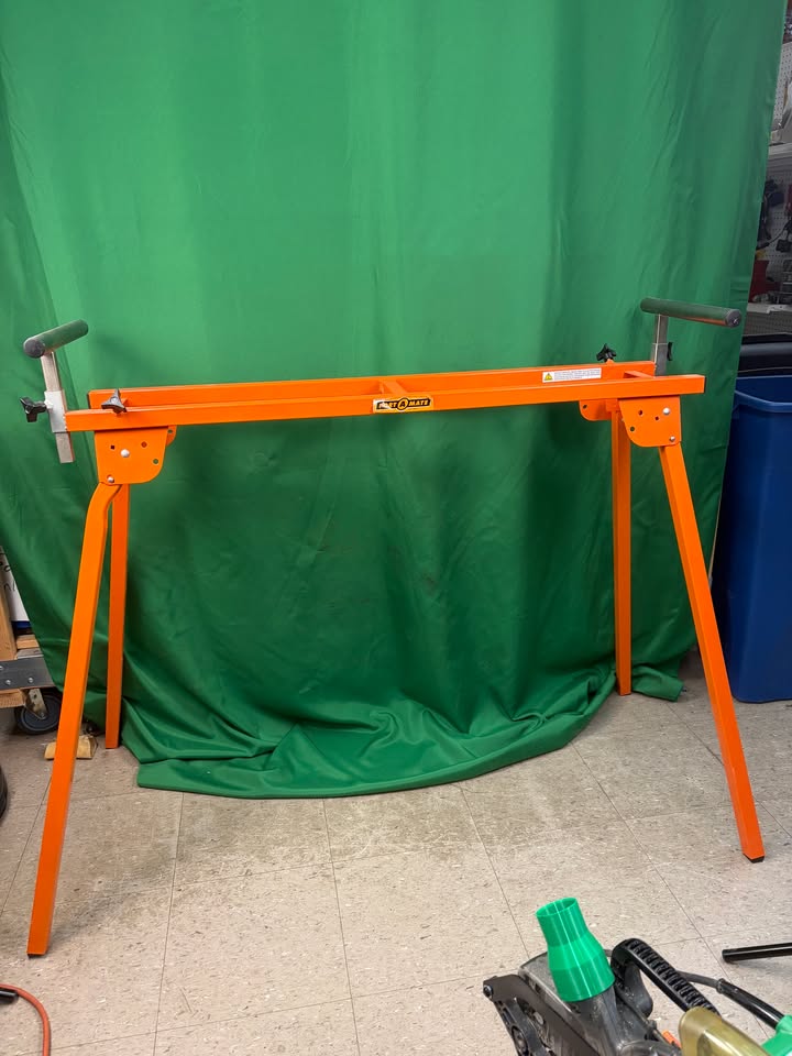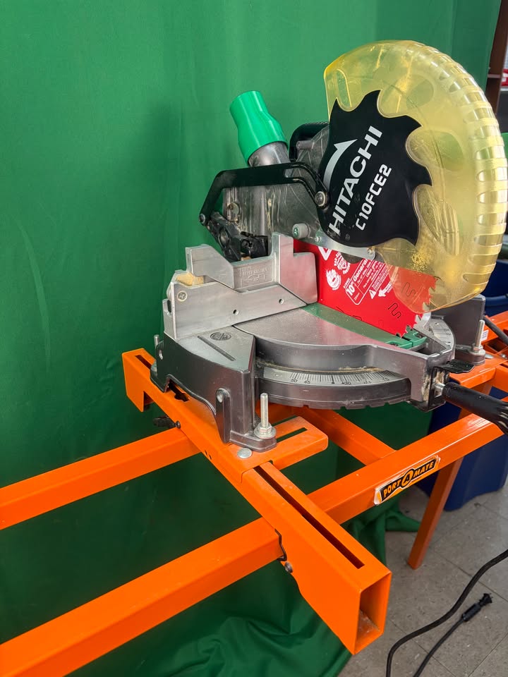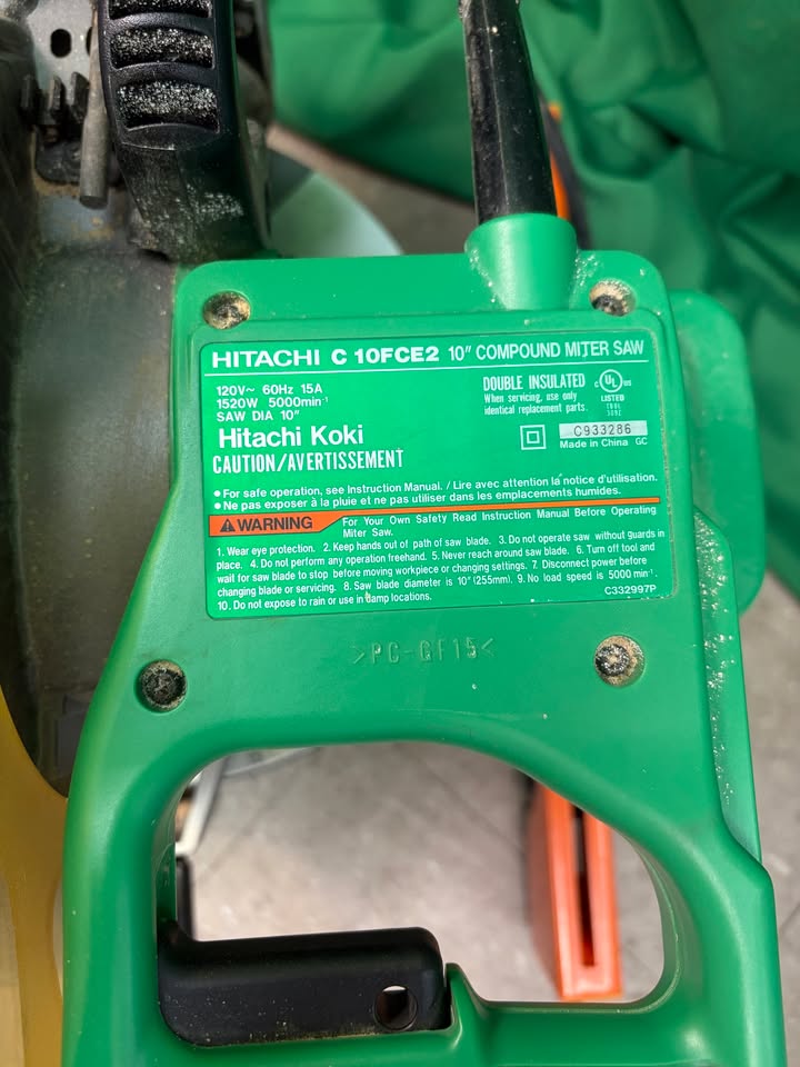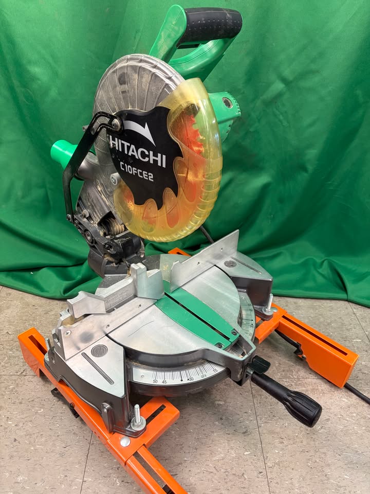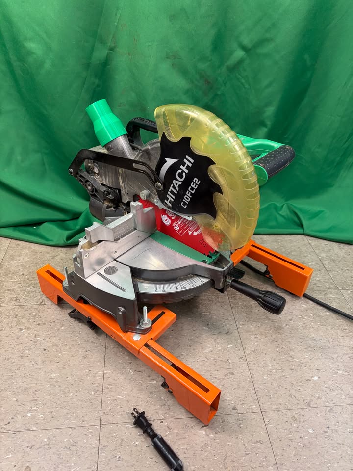 Hitachi 10″ miter saw C10FCE2 with metal folding miter saw stand by Port A Mate. The stand folds to be extremely compact and the saw brackets make putting the saw on extremely easy. Saw itself is in great shape and is ready for work.
