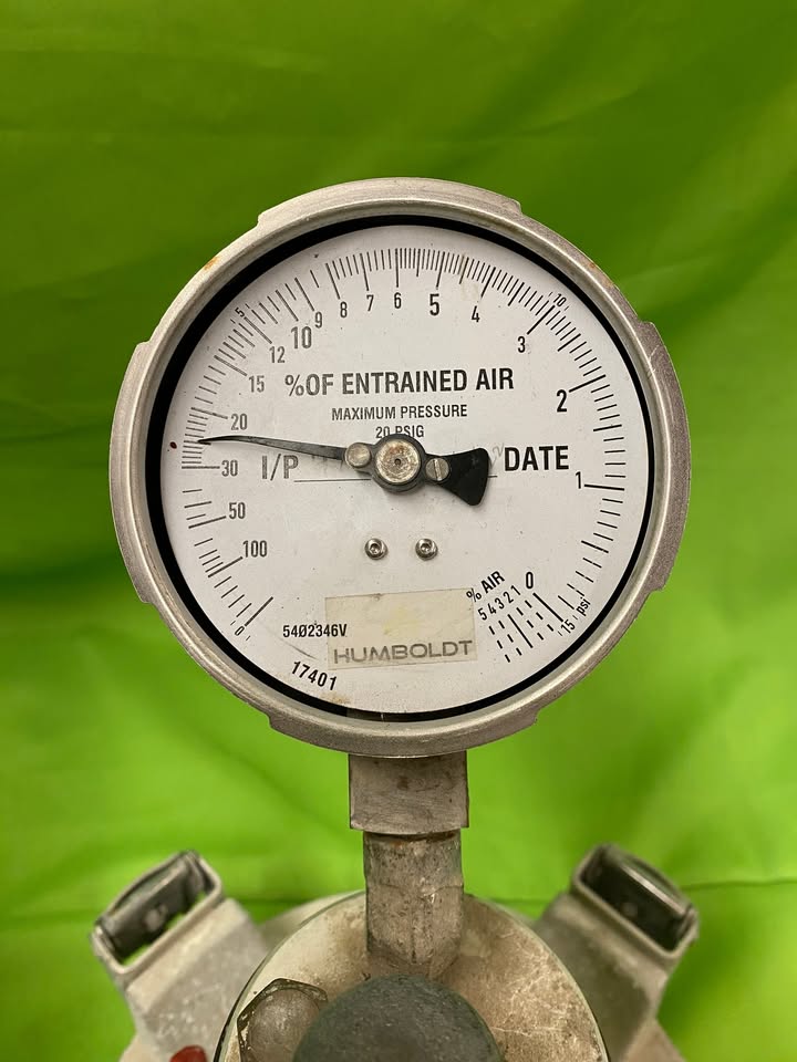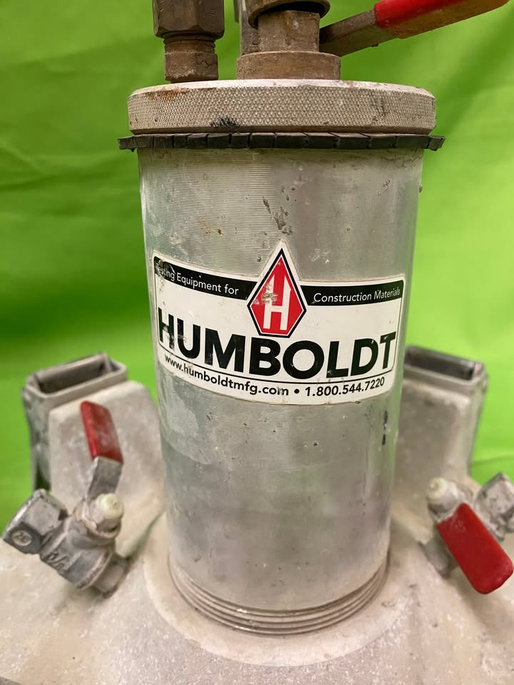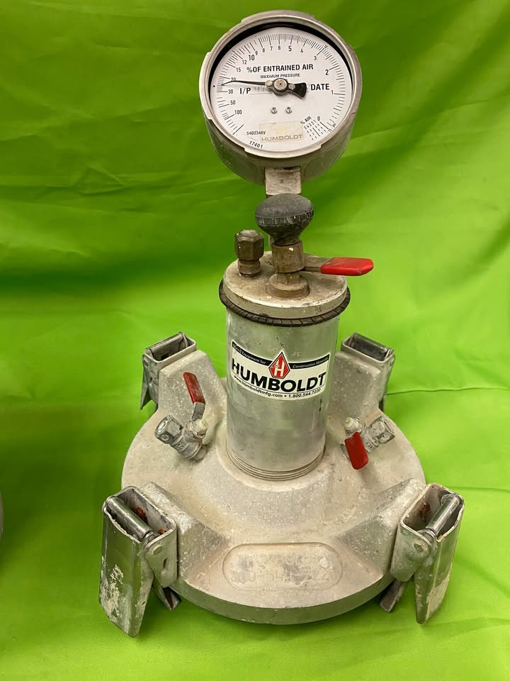 Humboldt concrete air meter, built for accurate testing of air content in fresh concrete. Rugged construction with heavy-duty clamping system, precision gauge, and durable bucket design for reliable use in the field or lab.