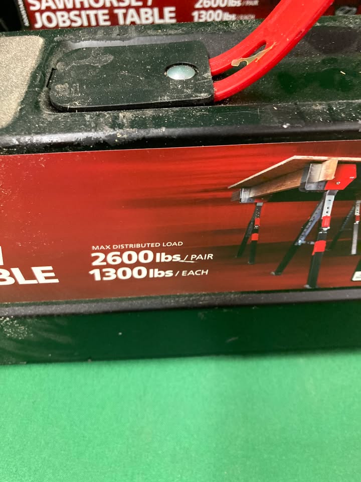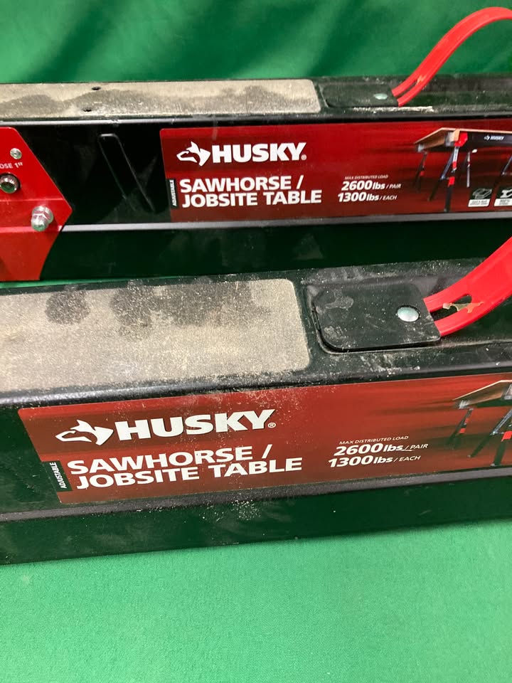 A pair of Husky folding sawhorses. Can convert to a work table. 2600lb load capacity for the pair.