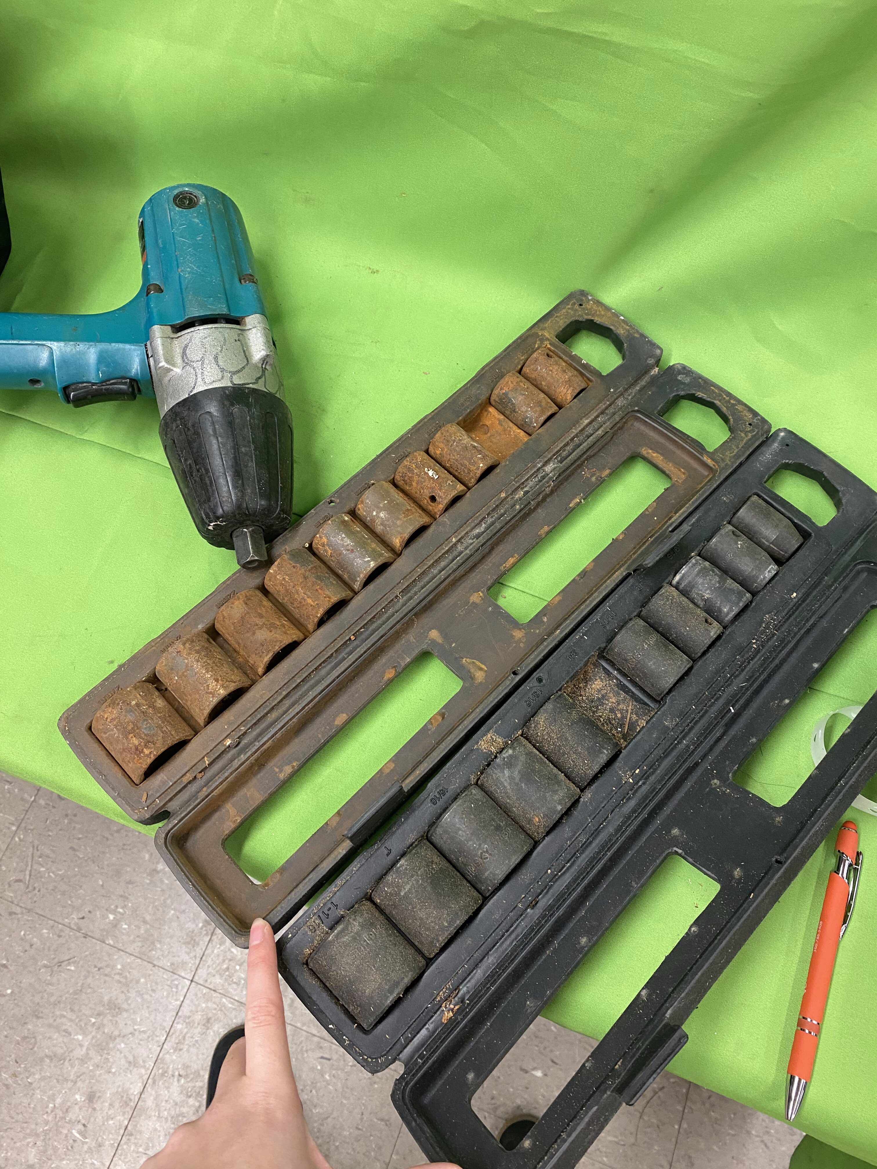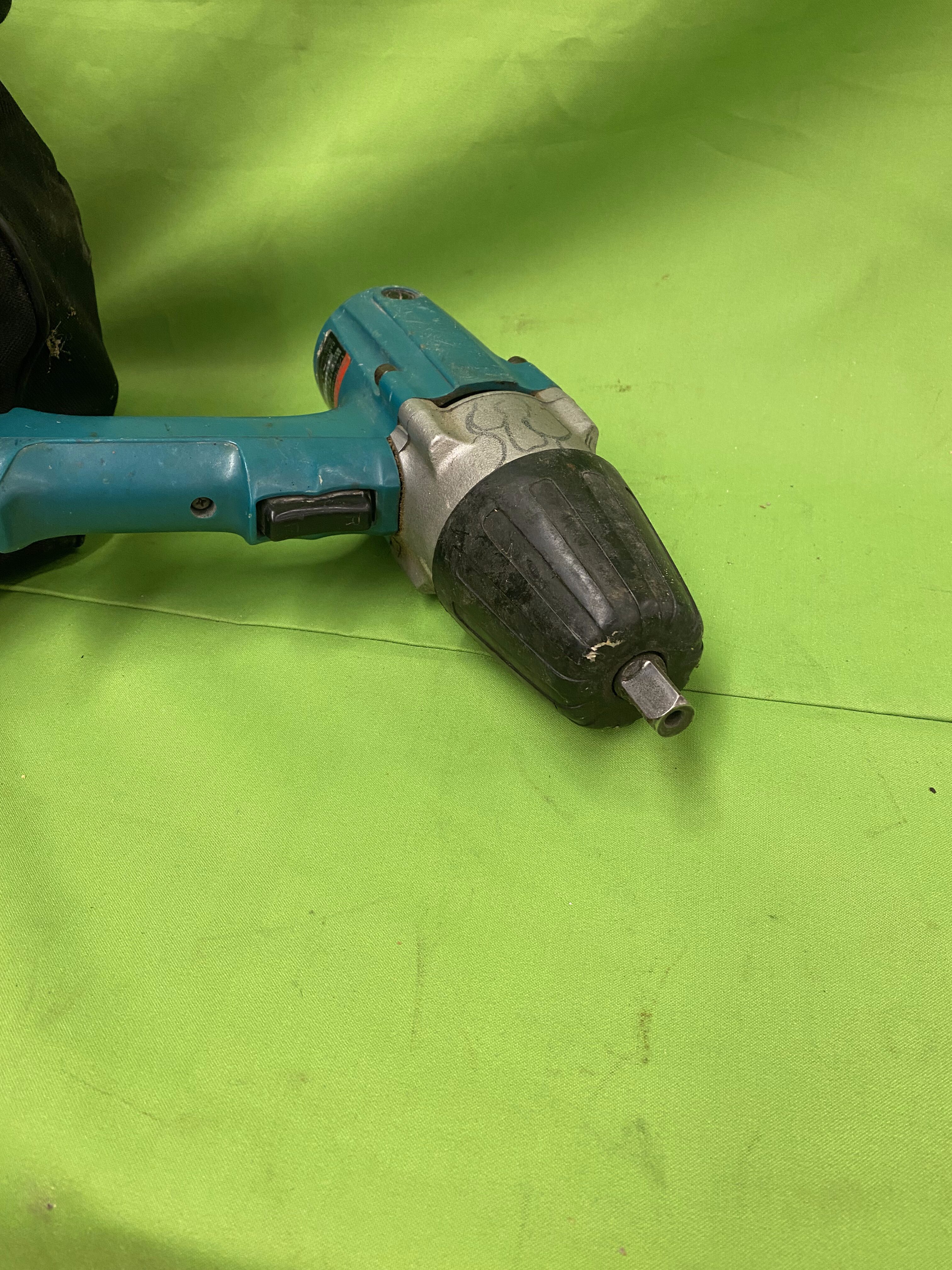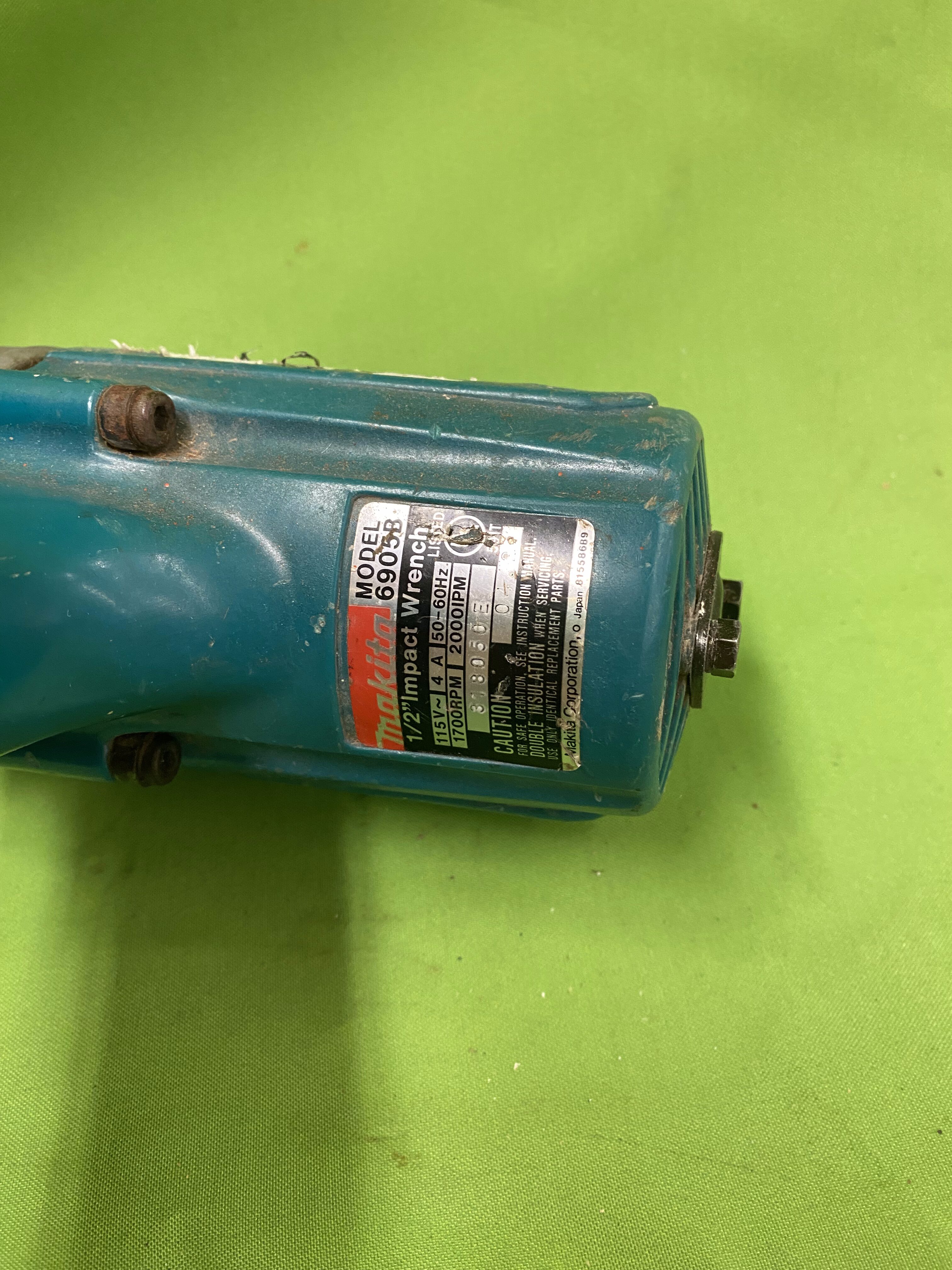 Heavy-duty Makita 6905B ½″ square drive impact wrench with a maximum torque of around 294 N·m (~217 ft-lbs) and delivering about 2,000 blows per minute at no-load speed of 1,700 RPM. It features precision-machined gears, a rocker switch for forward/reverse, and a sturdy rubber bumper for jobsite durability. Includes a set of metric and a set of imperial sockets, both missing one piece.