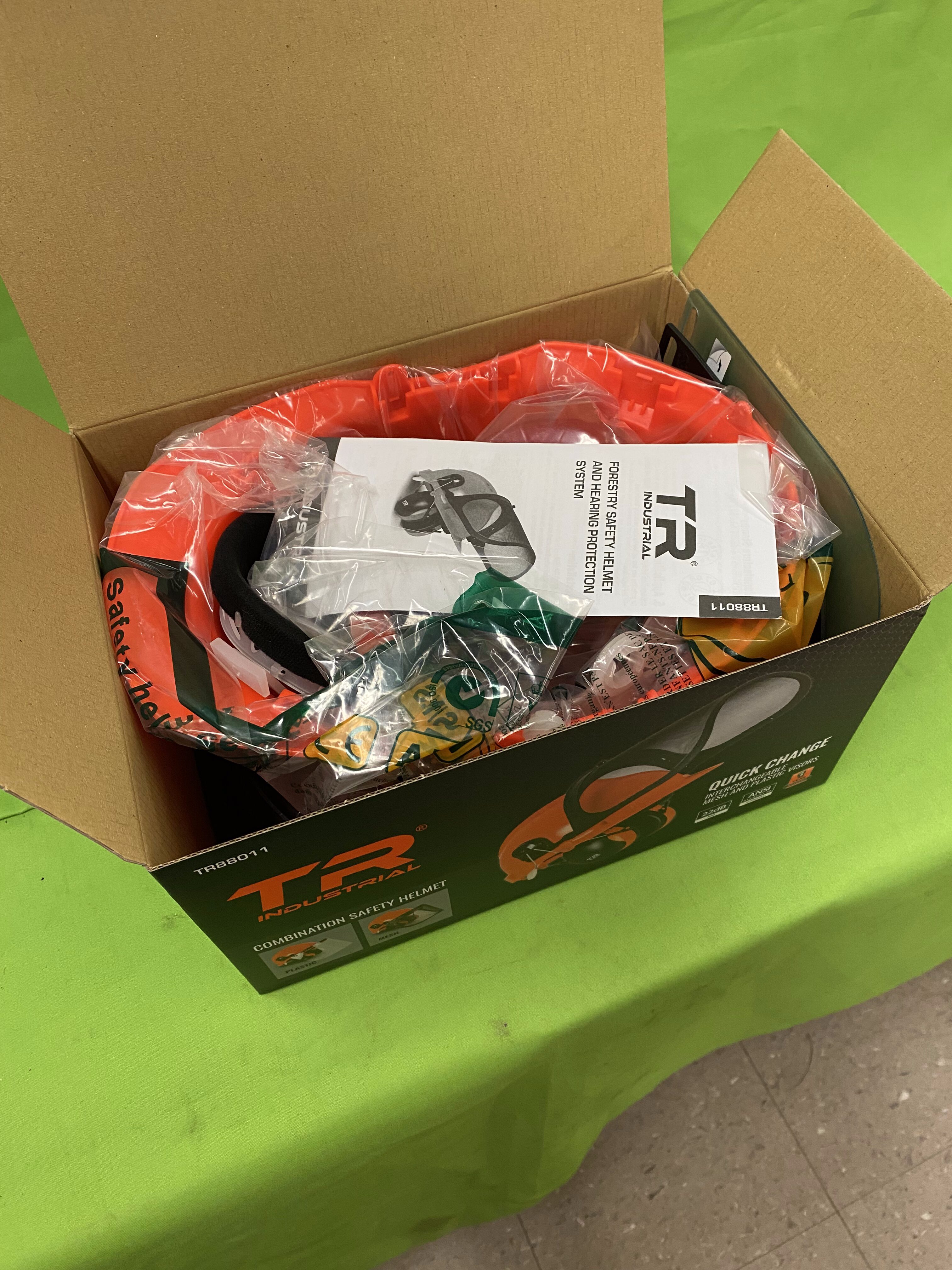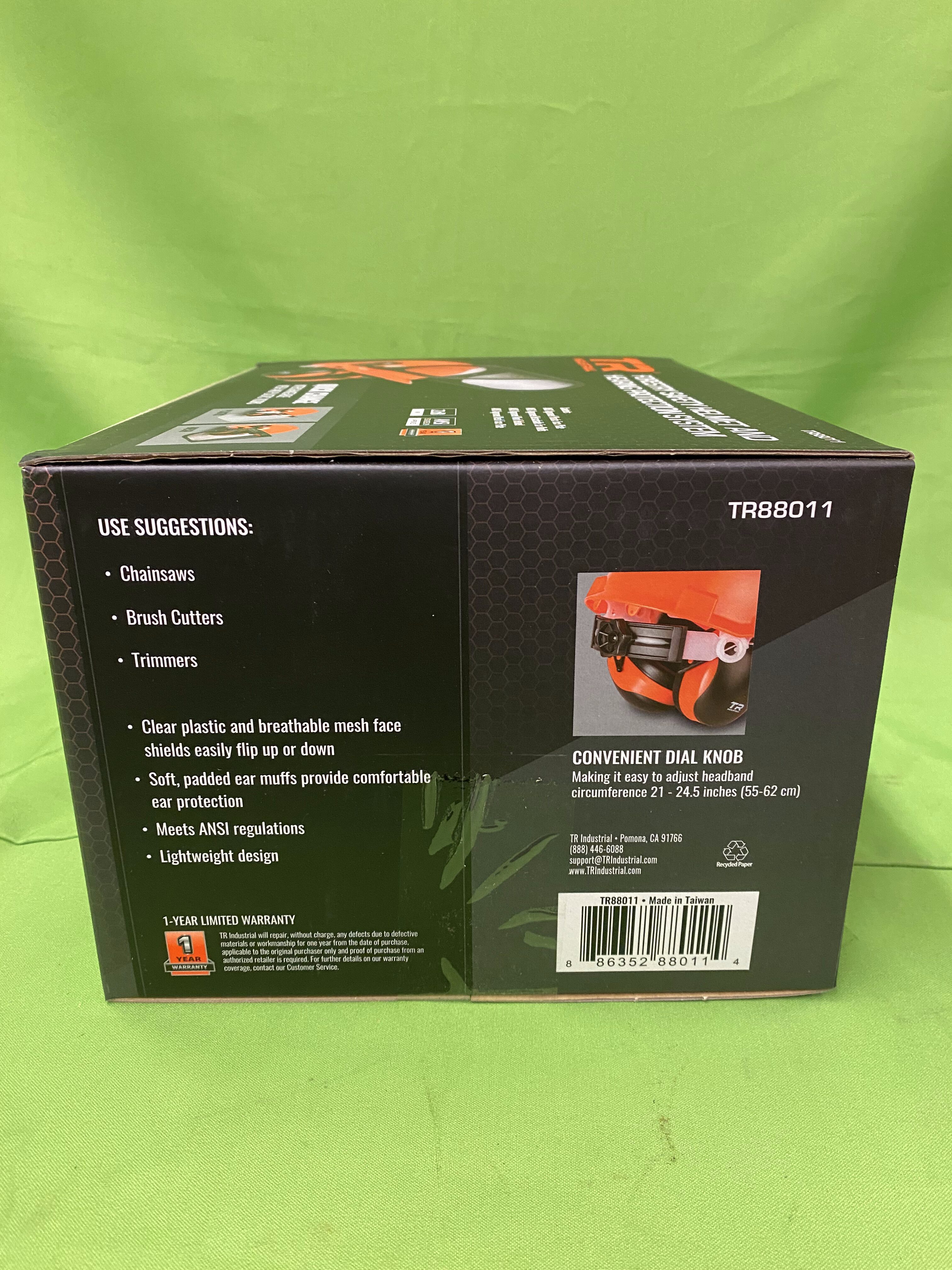 TR Industrial forestry safety helmet with built in hearing protection and quick change full face mask. Meets ANSI regulations.