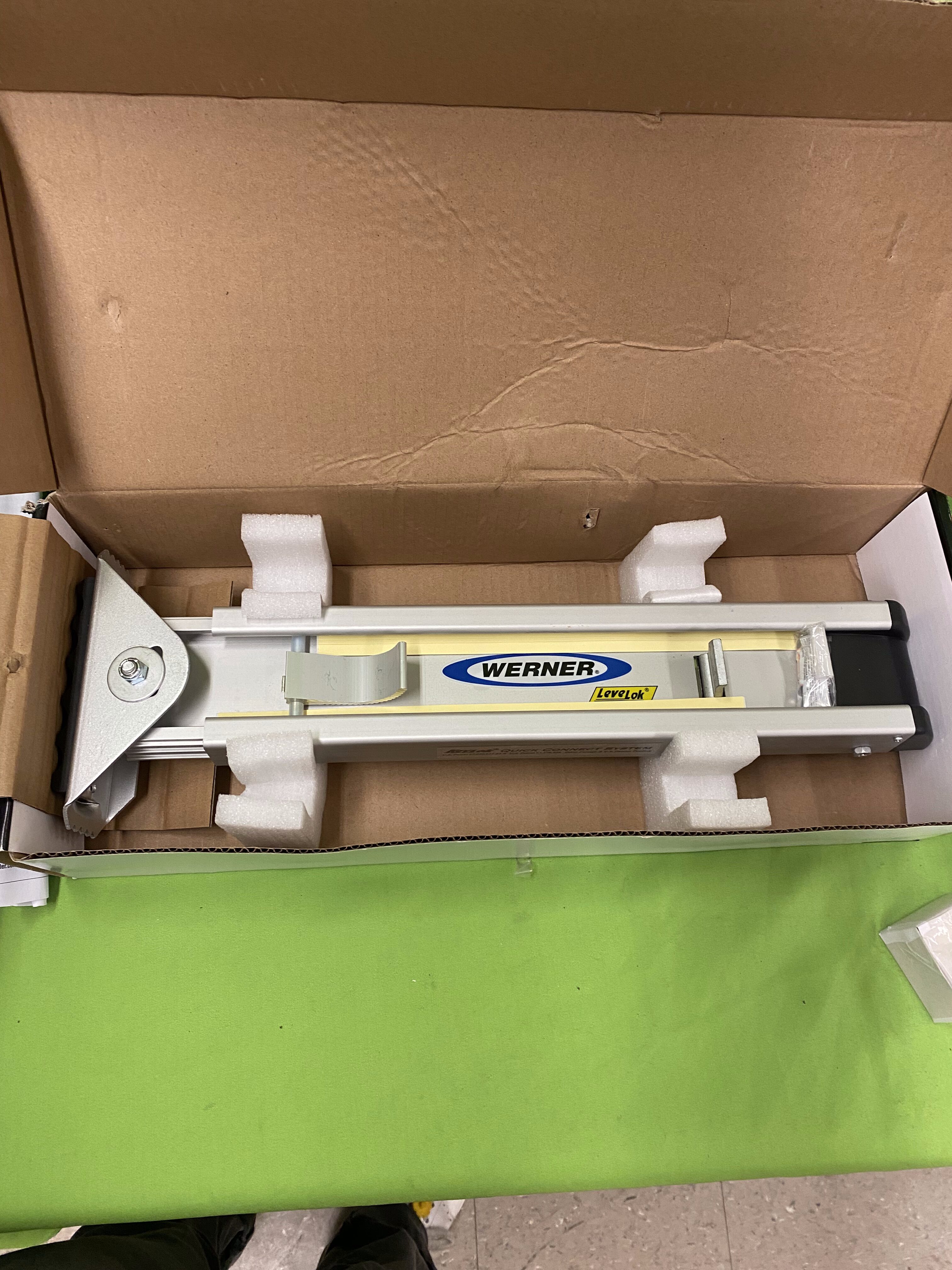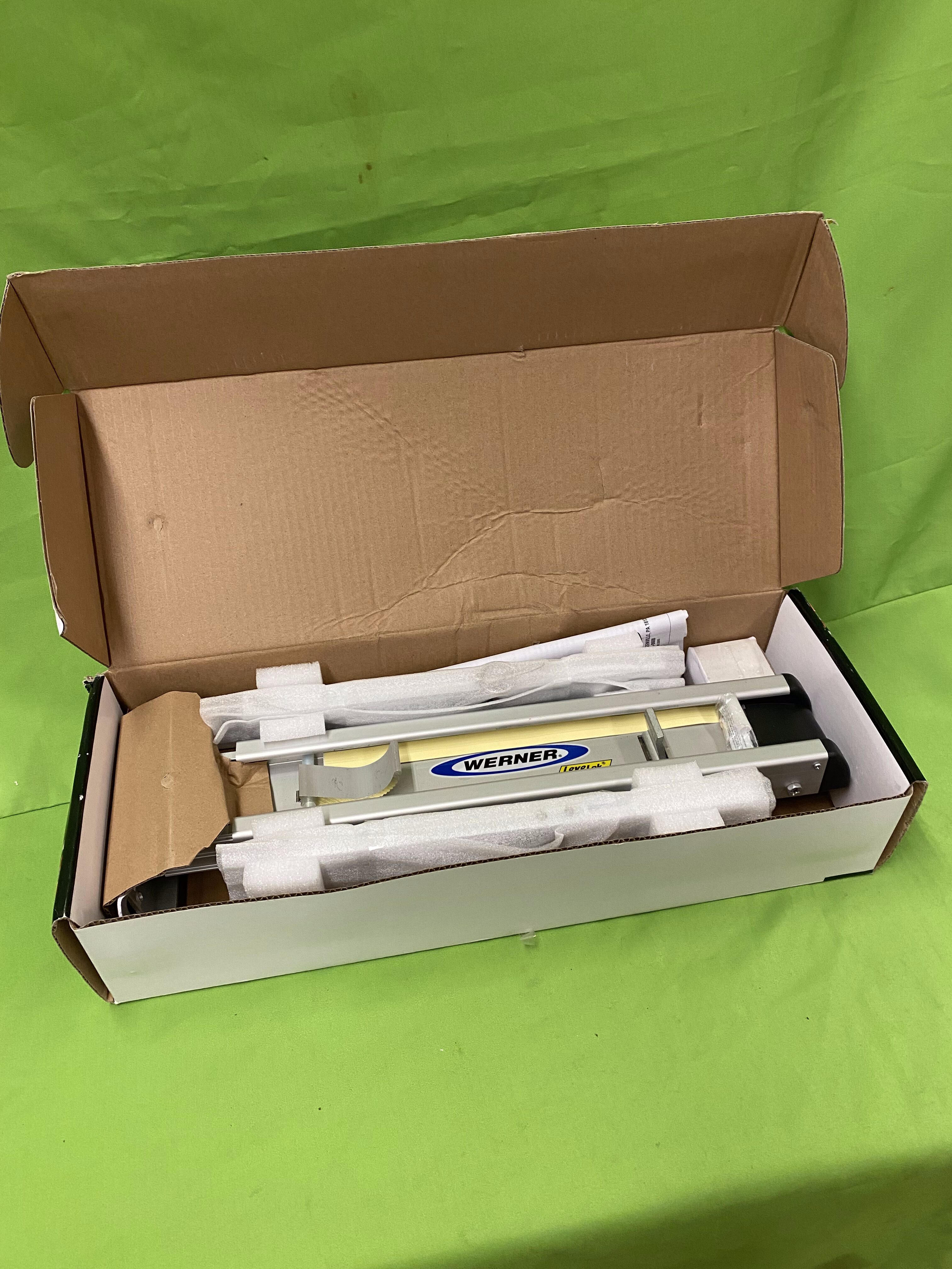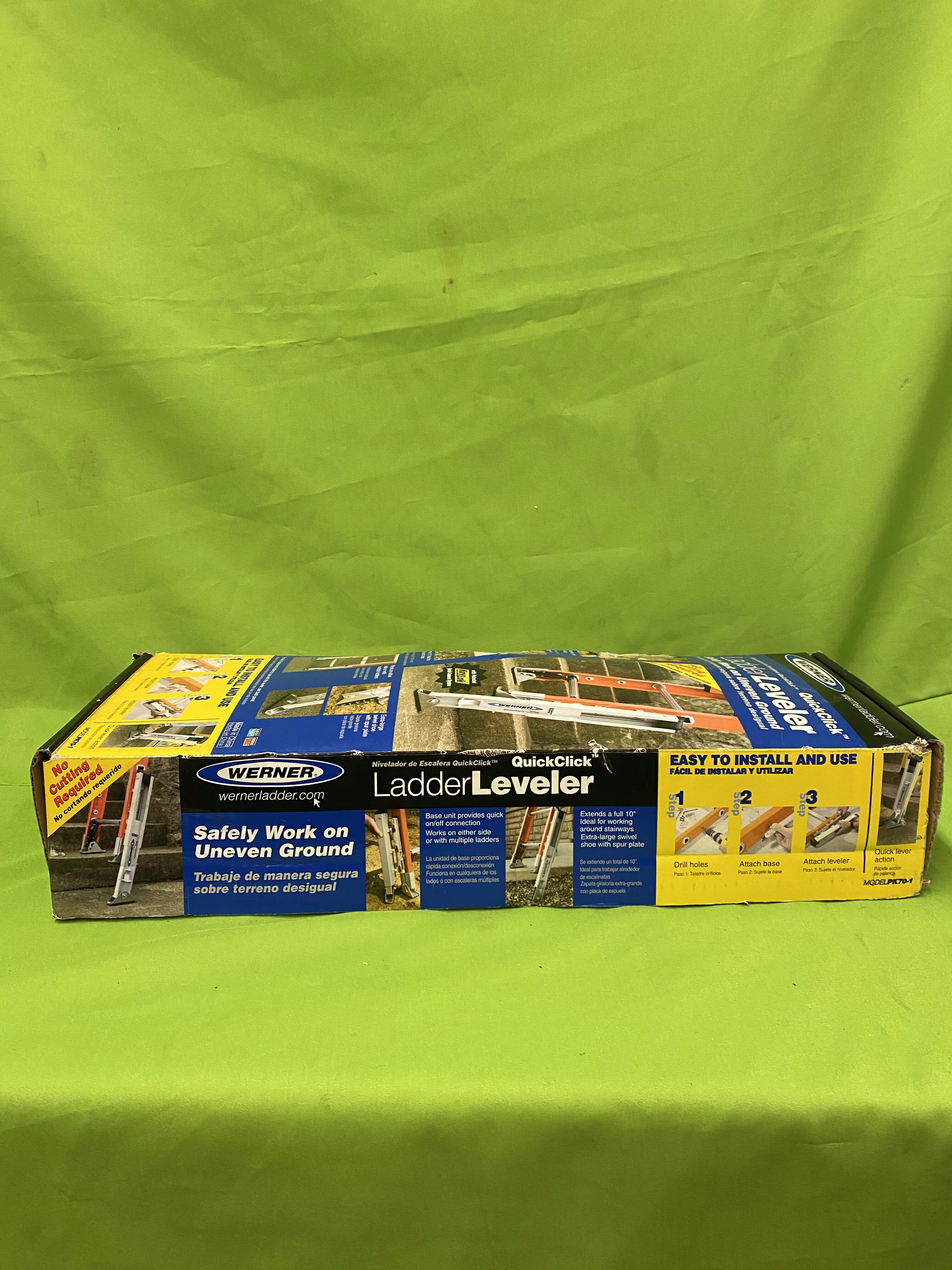 Brand new Werner Quick Click ladder leveler designed to help stabilize your ladder on uneven terrain. The Quick Click mounting system lets you attach or detach the leveler quickly and without tools. It features swivel shoes (with ice picks) for solid grip on a variety of surfaces and provides up to 8½ inches of vertical adjustment to compensate for slope or gradient.