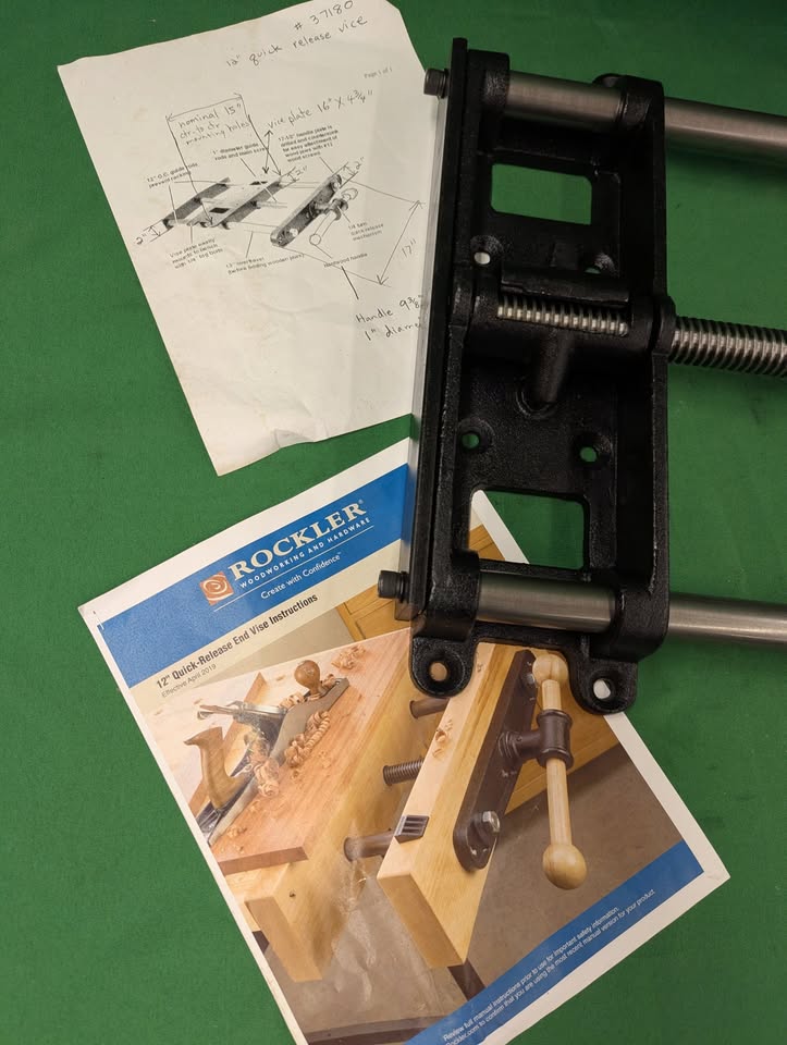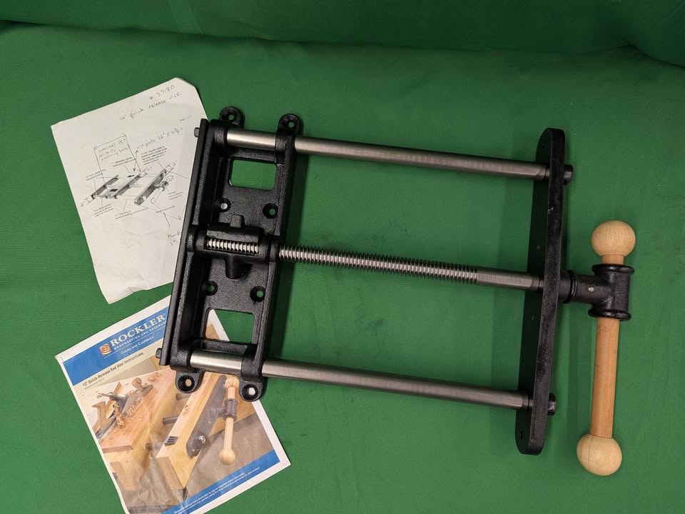 NEW! Rockler 12″ quick release end vice. This heavy-duty, easy-to-install steel vise will be the workhorse of your custom workbench! Machined pivoting nut engages or releases with a 1/4 turn of the 1″ dia. main screw so you can easily re-position your workpiece. Extra-wide 12″ O.C. guide rods provide maximum resistance to racking, while extra-wide 17-1/2″ handle plate delivers maximum stability to handle any project.