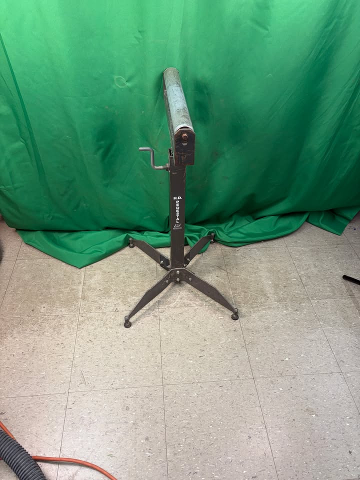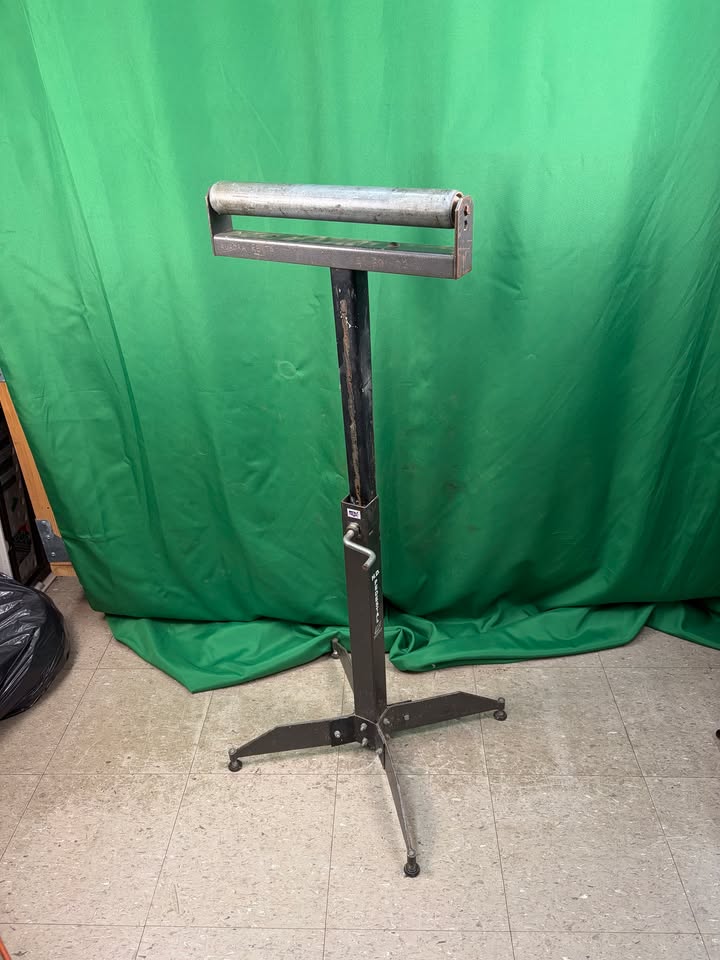 Heavy duty fully metal roller stand by HTC products, has adjustable feet and easily adjustable height.