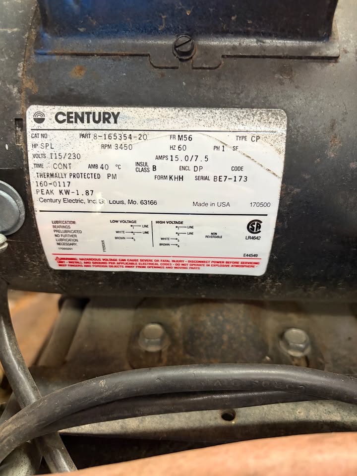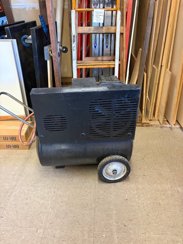 Portable and durable air compressor by Sanborn, ~15 gallons. 2 1/2″ HP.