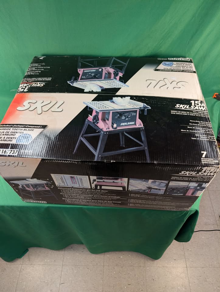 Portable 10″ Skil tablesaw. New in box. Stand included. Carbide tipped blade.