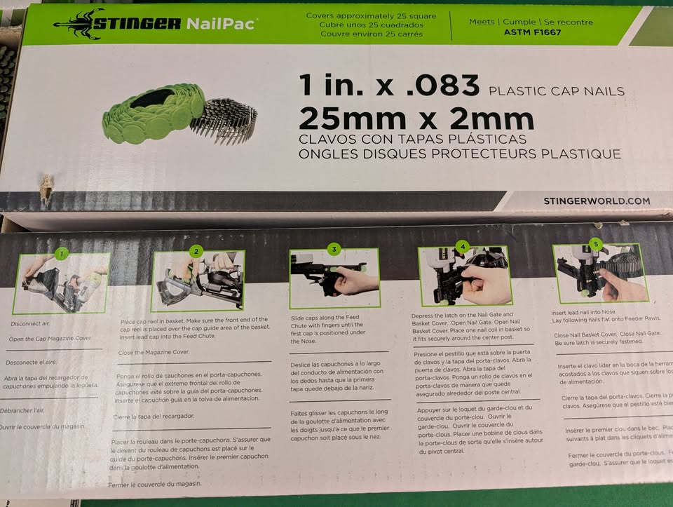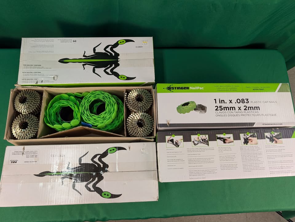 Stinger brand collated roofing nails and caps (to protect underlayment). 5 boxes available as of posting. Works with Stinger roofing nailers.