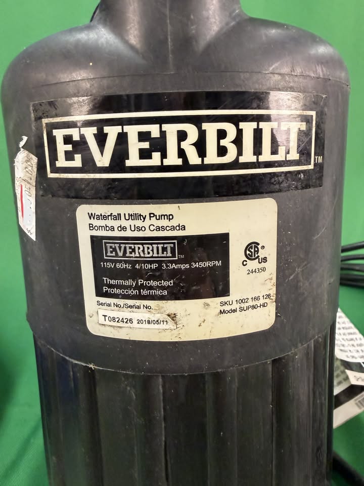 Everbilt model SUP80-HD waterfall utility pump with folding discharge hose. Used but in good condition.