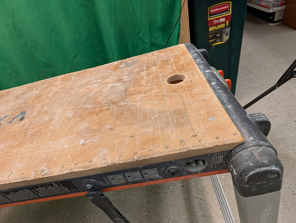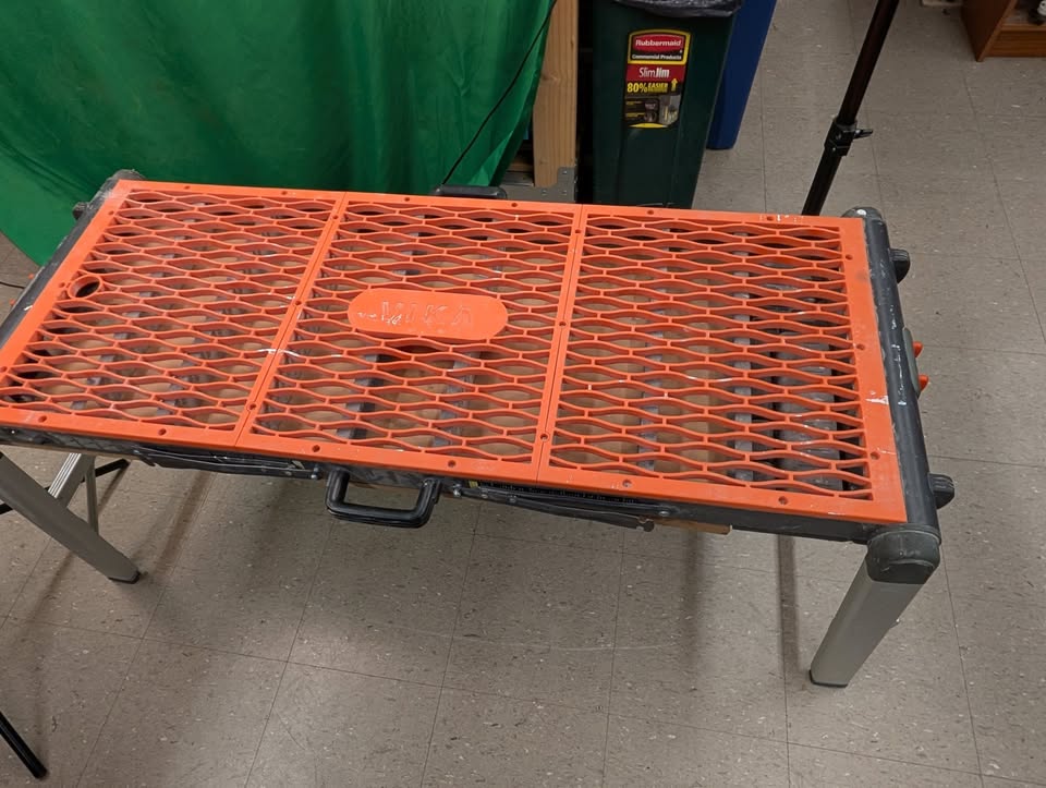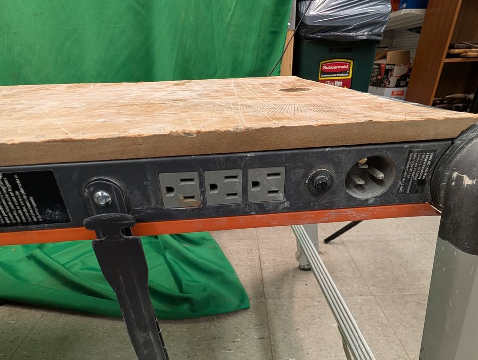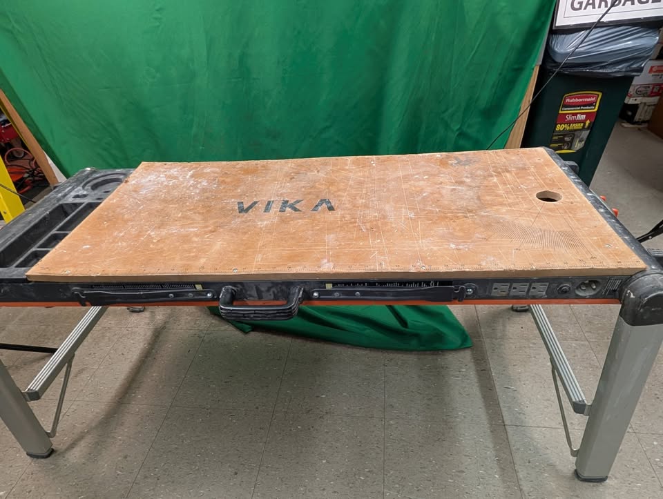 Reversible top folding workbench by Vika. One side includes a MDF top with various useful measurements and small plastic cubbies. The other is a plastic grid. It is also adjustable height and strong enough to be used as scaffolding in the lower height. There is a built in power strip to make using power tools easy and convenient. The dimensions of the top are 19″ by 48″.
