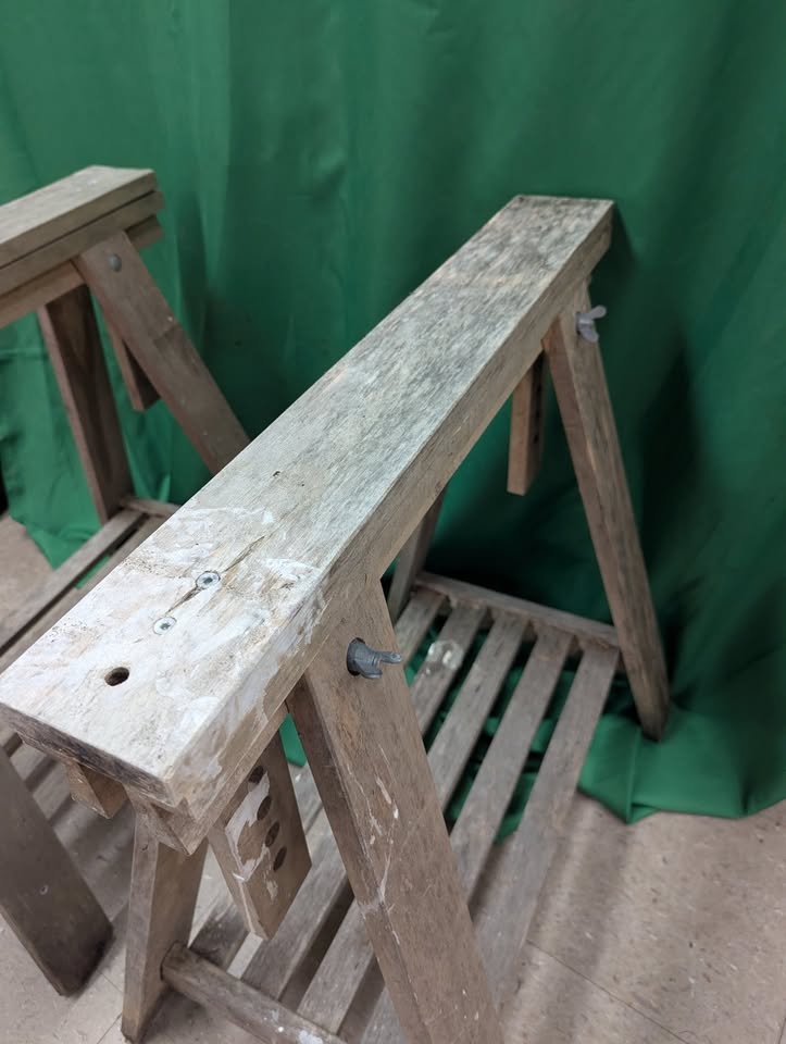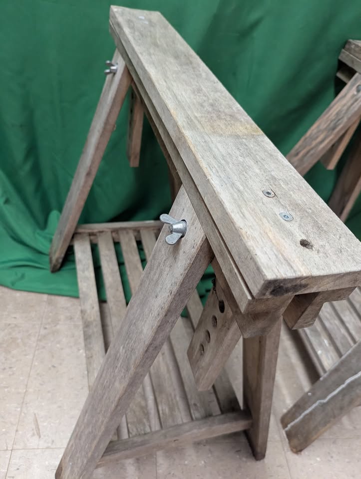 A pair of worn but nice looking wooden sawhorses with built in shelves.